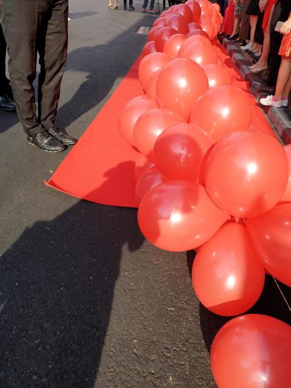Als wir so vor dem Hotel stehen und auf das Auto warten, wundern wir uns über die prall gefüllten roten Luftballons und wie die Mitarbeiter des Hotels dahinter Spalier auf dem Gehweg stehen.