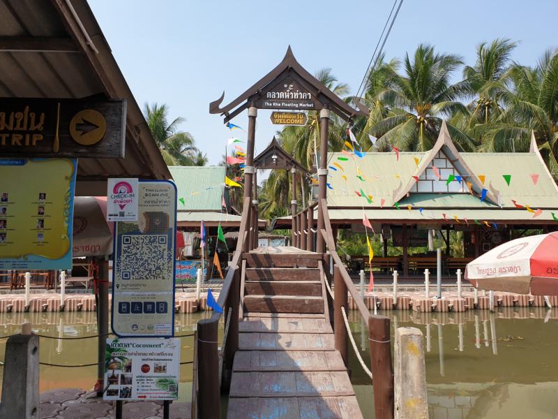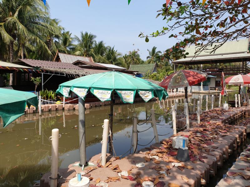 Ein paar Meter weiter duftet es verführerisch. In einer Art Freiluftküche köchelt ein karamellfarbener Sirup vor sich hin, der immer wieder umgerührt wird. Okay, gesehen und mehr dazu später. Jetzt fahren wir weiter zum Tha Kha Floating Market, der heute allerdings ziemlich verwaist ist, denn die Boote sind nur an bestimmten Tagen in den schmalen Kanälen unterwegs.