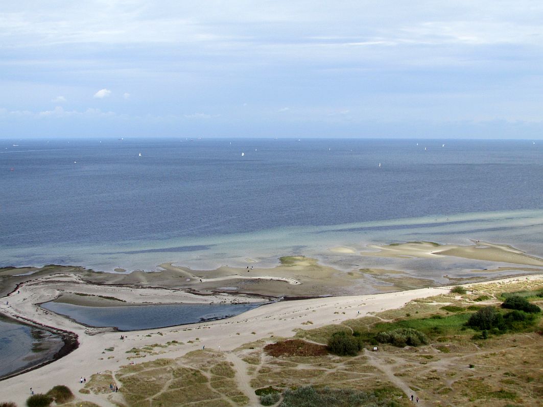 Nunmehr widme ich mich dem Ausblick gen Norden. Nur noch wenige hundert Meter trennen die Förde von ihrer Vereinigung mit der weiten Ostsee. Mit ein wenig Fantasie erinnern die Farben – wenn auch entfernt, wie ich zugeben muss – an einen karibischen Strand. Andererseits könnte man sich auch an einem Ort irgendwo an der Nordsee wähnen, so wie sich hier das Wasser zurückgezogen hat, da zum Spielball des Windes geworden. Und somit ein Paradies für Segler und Surfer.