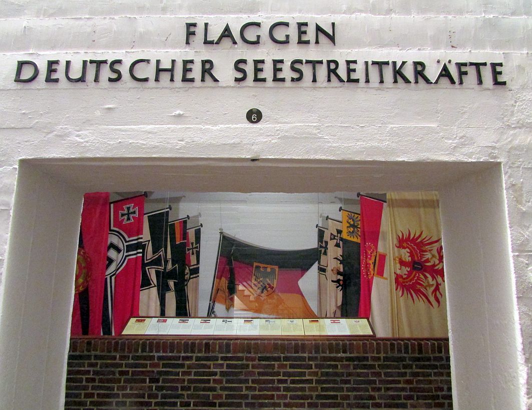 Im Flaggenraum werden dem Besucher Kriegsflaggen verschiedener Epochen präsentiert: angefangen bei den Reichskriegsflaggen des Kaiserreichs, der Kriegsmarine, den Flaggen der DDR-Volksmarine bis hin zur Bundesmarine. Verschiedene Epochen, verschiedene Farben und Symbole. Die einen sehr negativ behaftet, andere weniger. Doch sie alle gehören zur deutschen Geschichte, die keinesfalls immer „glanzvoll“ war.