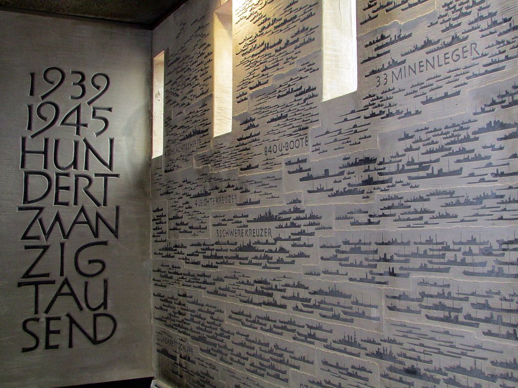 Entlang der Wand führt ein Gang um das mit Gebinden, Schleifen und Kränzen belegten Plateaus. Eine seltene Besonderheit ist in dieser Halle zu finden: ein Gedenkbuch des Volksbundes Deutsche Kriegsgräberfürsorge mit einer Liste aller im Zweiten Weltkrieg auf See Verschollenen.