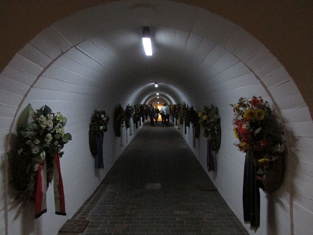 So ist es zu lesen, als ich ein paar Stufen hinuntergehe, denen sich ein langer, zu beiden Seiten mit Kränzen gesäumter Gang mit leichtem Gefälle und abgedunkelter Beleuchtung anschließt. Es geht unter die Erde.