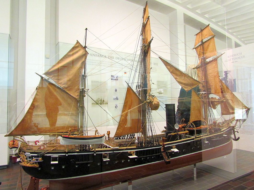 Widme ich mich nunmehr wieder dem oberirdischen Teil des Ehrenmals und einer Ausstellungsfläche, die mich ganz besonders in ihren Bann zieht: die historische Halle mit vielen maßstabsgetreuen Schiffsmodellen, alten Schiffs- und Seekarten sowie maritimen Exponaten, anhand derer die Geschichte der Schifffahrt und die Entwicklung der Marine erklärt werden.