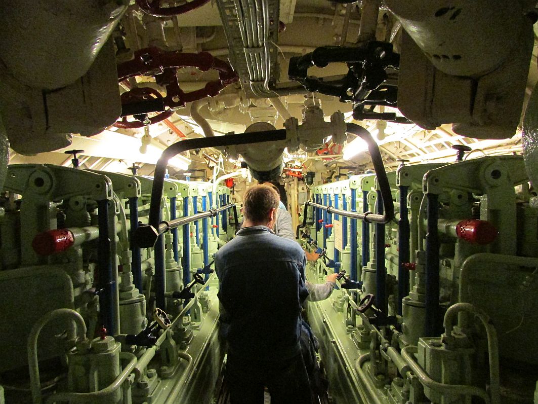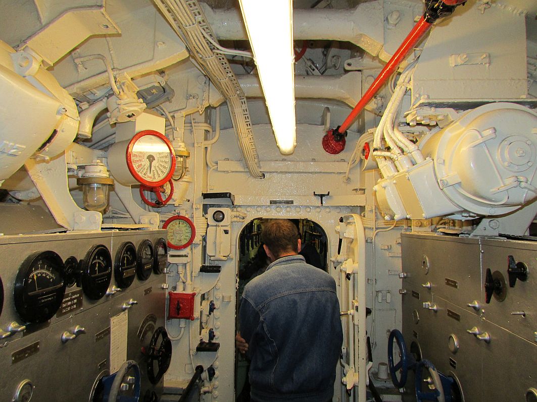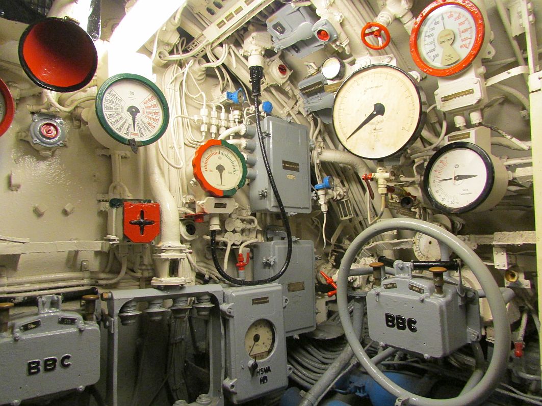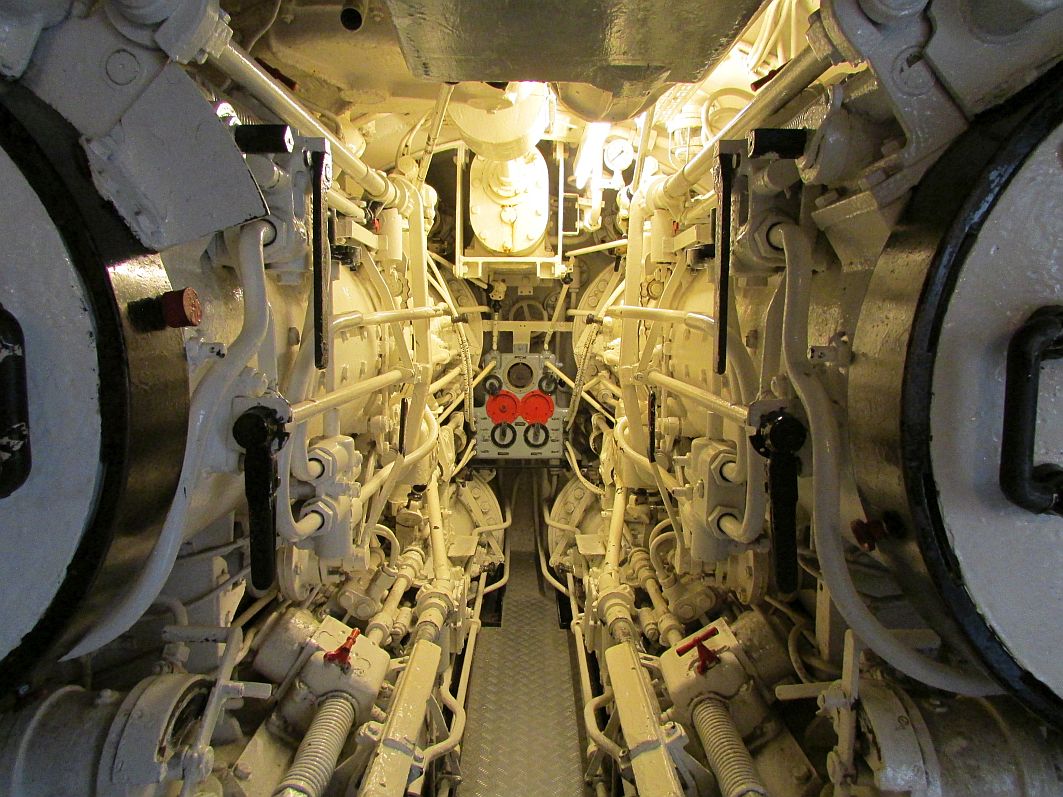 Frauen wird ja immer wieder gern mal nachgesagt, dass sie und die „Technik“ sich nicht unbedingt vertragen. Von daher verzichte ich hier auf umfangreiche technische Beschreibungen, für die ich zugegebenermaßen entweder einschlägige Fachliteratur zu diesem Thema (die ich nicht habe) oder Wikipedia zu Rate ziehen müsste. In erster Linie lasse ich einfach ein paar Bilder sprechen, versehen mit einer kurzen Beschreibung. Die Enge des U-Bootes, das eine Besatzung von bis zu 50 Seeleuten hatte, wird auf jeden Fall deutlich.