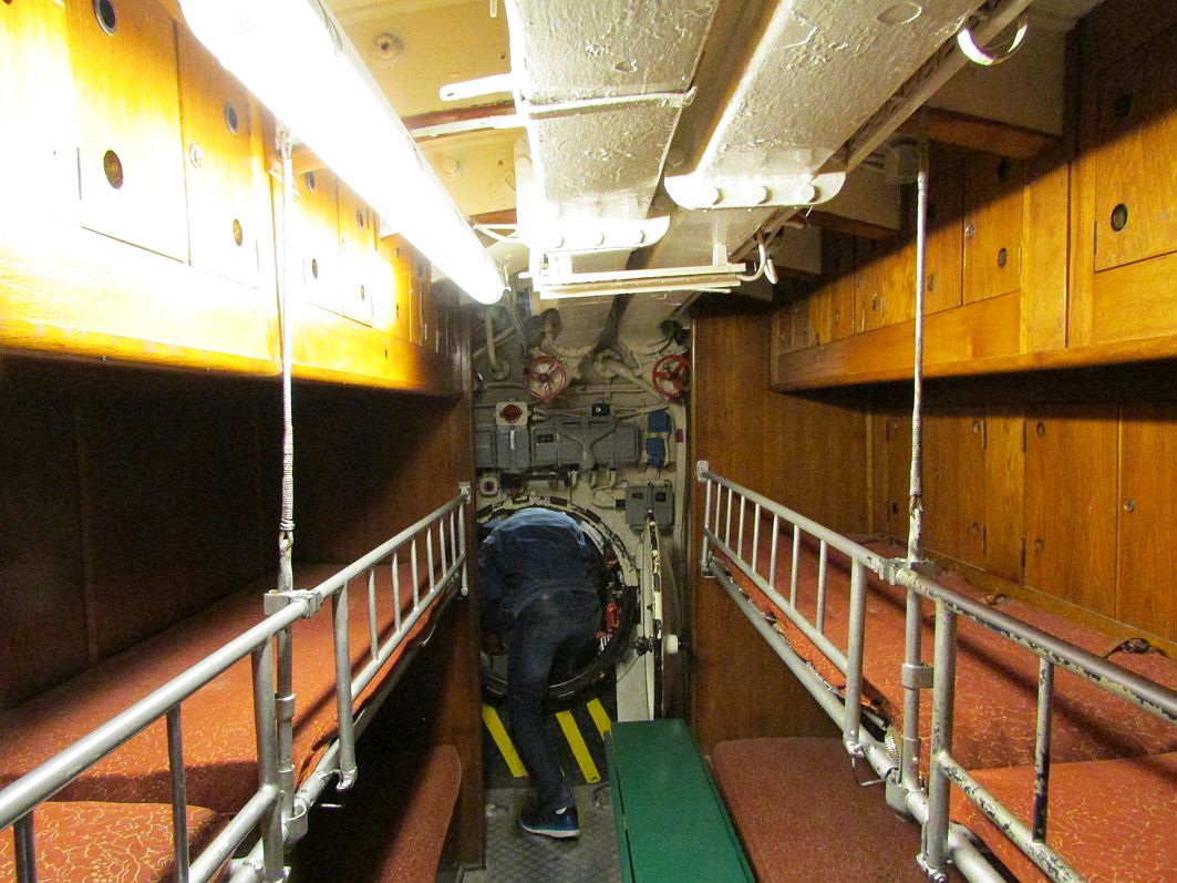 Einige der schmalen, harten Kojen – Wenn ich so das dahinter liegende Druckschott betrachte, fallen mir unwillkürlich Szenen aus dem Kino-Klassiker „Das Boot“ mit „Herrn Kaleun“ Jürgen Prochnow ein. Die Mannschaft schwang sich damals in Windeseile durch die kreisrunde Öffnung. Gut, dass uns niemand dabei filmt, wie unelegant wir alle dort hindurch klettern.