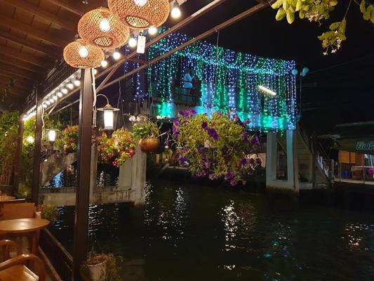 Also die Bahnfahrt war schon ein Erlebnis, da sind wir uns einig. Aber der Tag ist noch nicht zu Ende. Wir fahren ein Stück mit dem Auto und zwar nach Amphawa. Der kleine Ort liegt sieben Kilometer vom Bahnhof in Mae Klong entfernt. Was gibt es dort besonderes zu sehen, fragen wir uns. Amphawa liegt ebenfalls am Fluss Mae Klong und schaut auf eine historische Geschichte zurück. Mitte des 17. Jahrhunderts tauchte dieser Ort erstmals in Beschreibungen auf. Landwirte und Händler lebten dort und es ist auch der Geburtsort von König Rama II. Kanäle durchziehen die Landschaft, denn früher wurde so gut wie alles auf dem Wasserweg transportiert und der Verkauf der Waren erfolgte von Booten aus – die schwimmenden Märkte versorgten die Menschen. Und heute lockt Amphawa Touristen und auch Thais hierher, um einen Bummel zu machen und etwas in den vielen kleinen Läden am Rande der Kanäle zu kaufen. Es gibt unzählige Restaurants, doch auch Boote mit Speisen sind hier unterwegs.