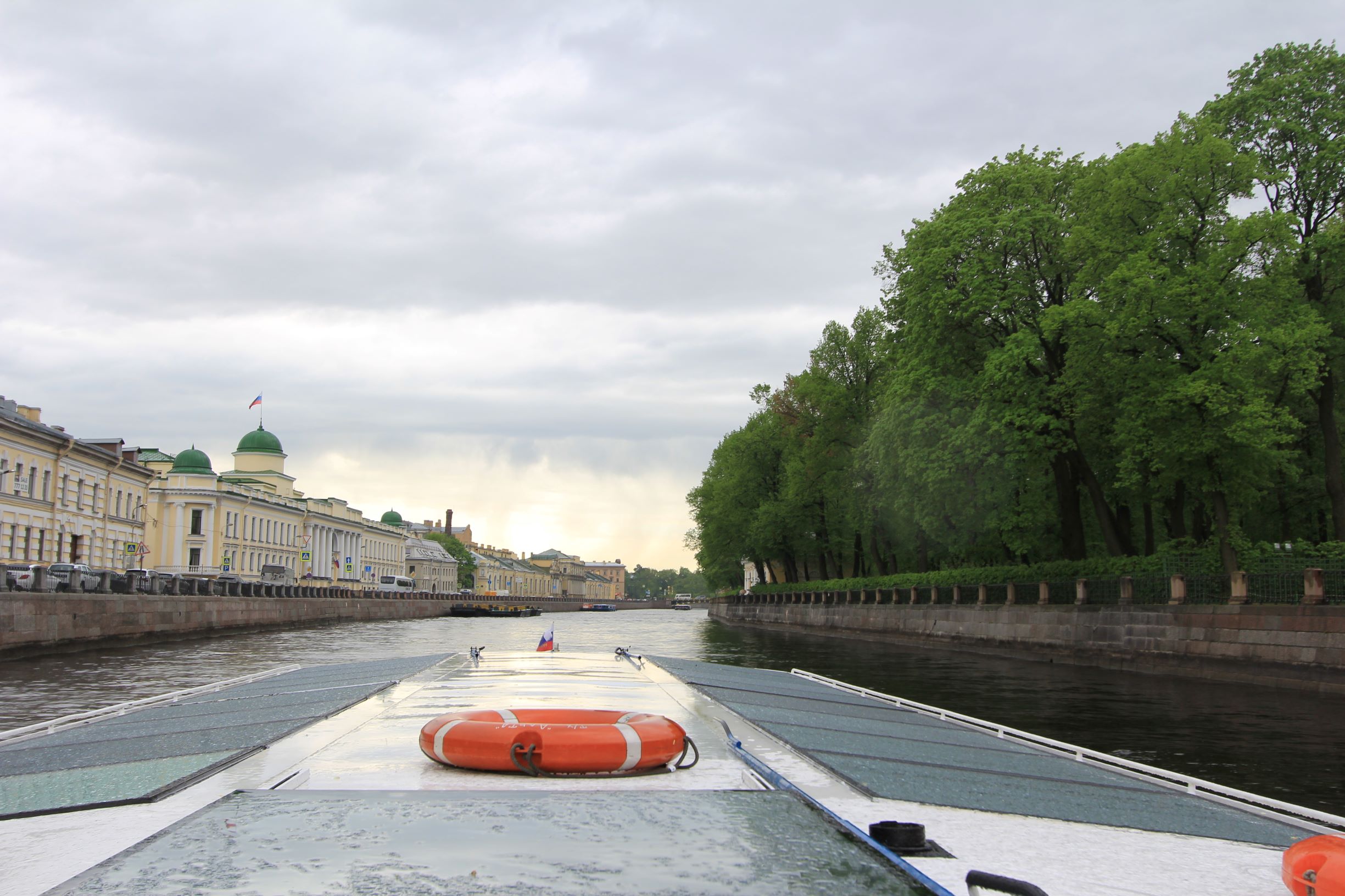 Es regnet ein bisschen, aber wir machen trotzdem wie geplant unsere Bootsfahrt auf der Newa und den Kanälen.