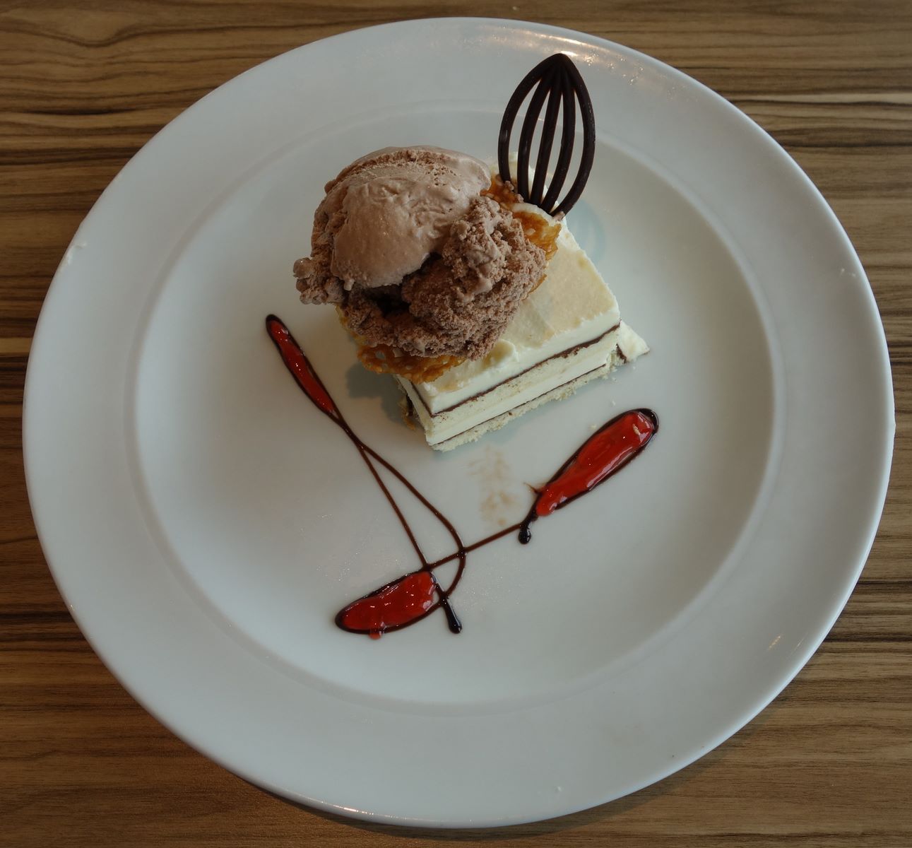 Und nicht nur durch die teils mit kleinen Details aufgewertete Anrichtung, sondern vor allem auch durch den Geschmack der Speisen, wurde hier einiges des fehlenden Buffets kompensiert. Ansonsten eher keine Freunde von solcherart „Tellerphotos“, war es diesmal schon ein festes Ritual, den Teddys mit solchen Nachtischfotos das Maul wässrig zu machen.