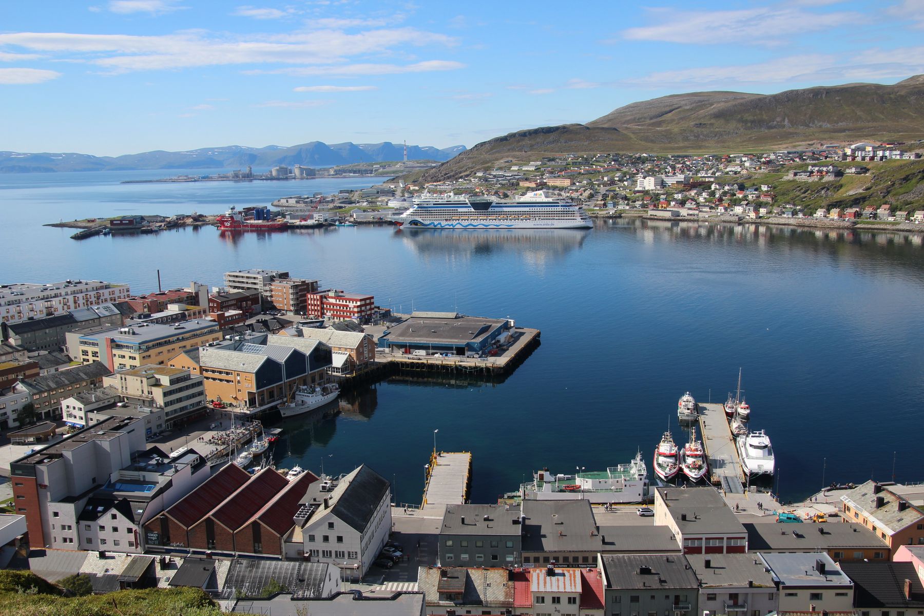 Nach Besichtigung der Hammerfest Kirche spazierten wir auf den Berg Salen – naja „Berg“, er ist nur 86 Meter hoch. Jetzt war es so warm, dass wir im T-Shirt die Sonne genießen konnten. Auf dem serpentinenartigen Weg hatten wir hinter jeder Kurve eine neue schöne Perspektive auf Hammerfest, den Hafen und natürlich die AIDAluna: