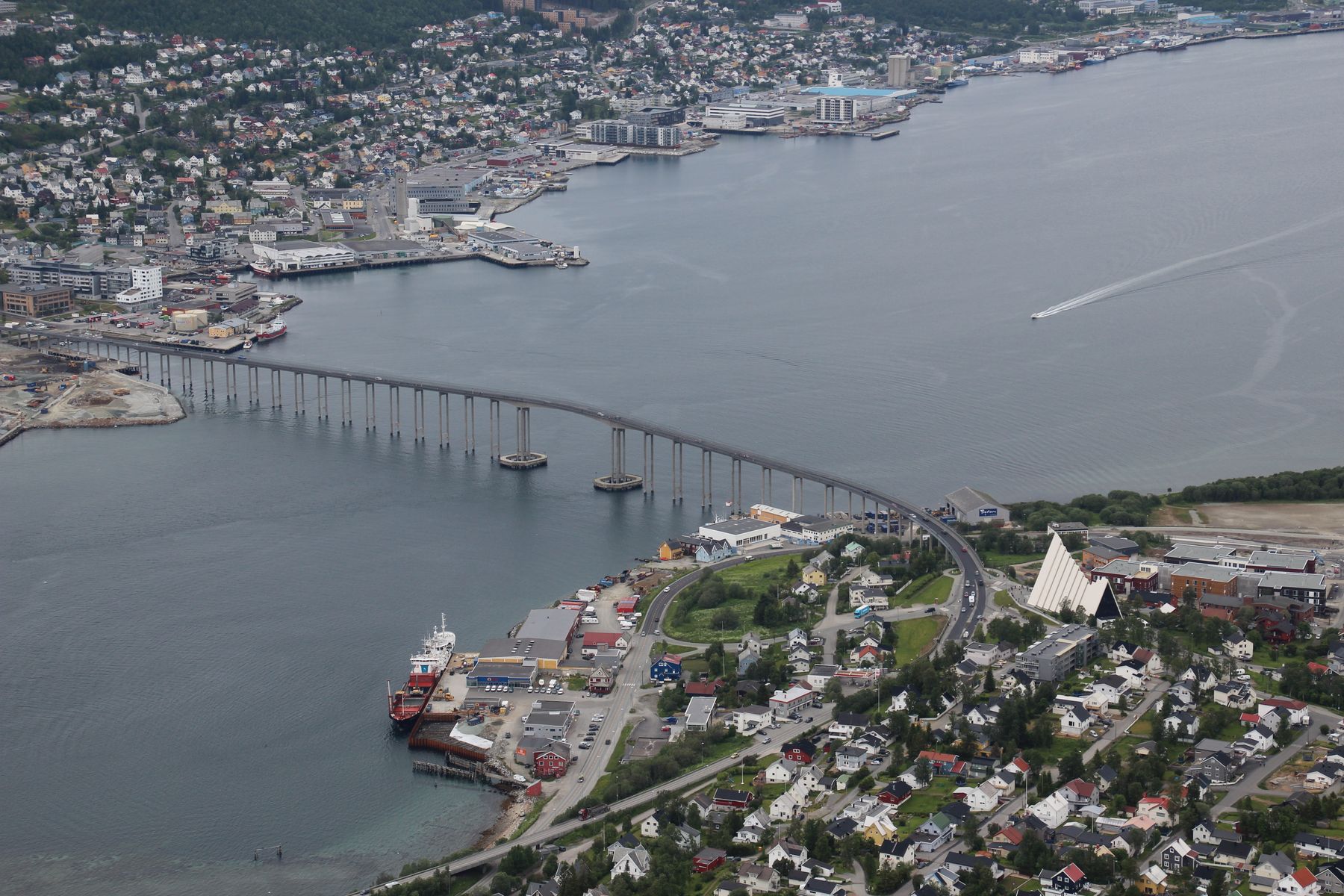 Direkt vor der Kathedrale beginnt die 1.016 m lange Tromsøbrücke, über die wir zu Fuß wieder auf die andere Seite des Flusses ins Zentrum liefen. Nach dem langen Fußweg über die Brücke kehrten wir direkt hinter der Brücke in einer Pizzeria ein und stärkten uns für den Nachmittag. Schließlich bummelten wir noch durch die Fußgängerzone von Tromsø (mit Souvenirkauf) und besichtigten die Domkirke, für die kein Eintritt erhoben wurde. Da es zwischenzeitlich recht kühl geworden war und sich der Himmel verdächtig verdunkelt hatte, kehrten wir bereits um 14.15 Uhr mit dem Shuttlebus zur AIDA zurück, wo wir ca. 10 Minuten später ankamen. Wir waren gerade wieder zurück auf dem Schiff, da setzte leichter Regen ein. Glück gehabt, wir waren ohne Schirm und Jacke unterwegs gewesen.