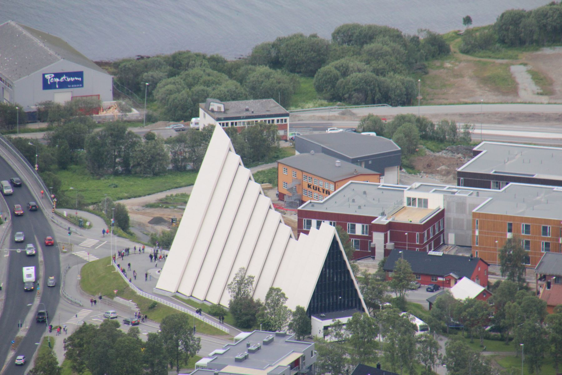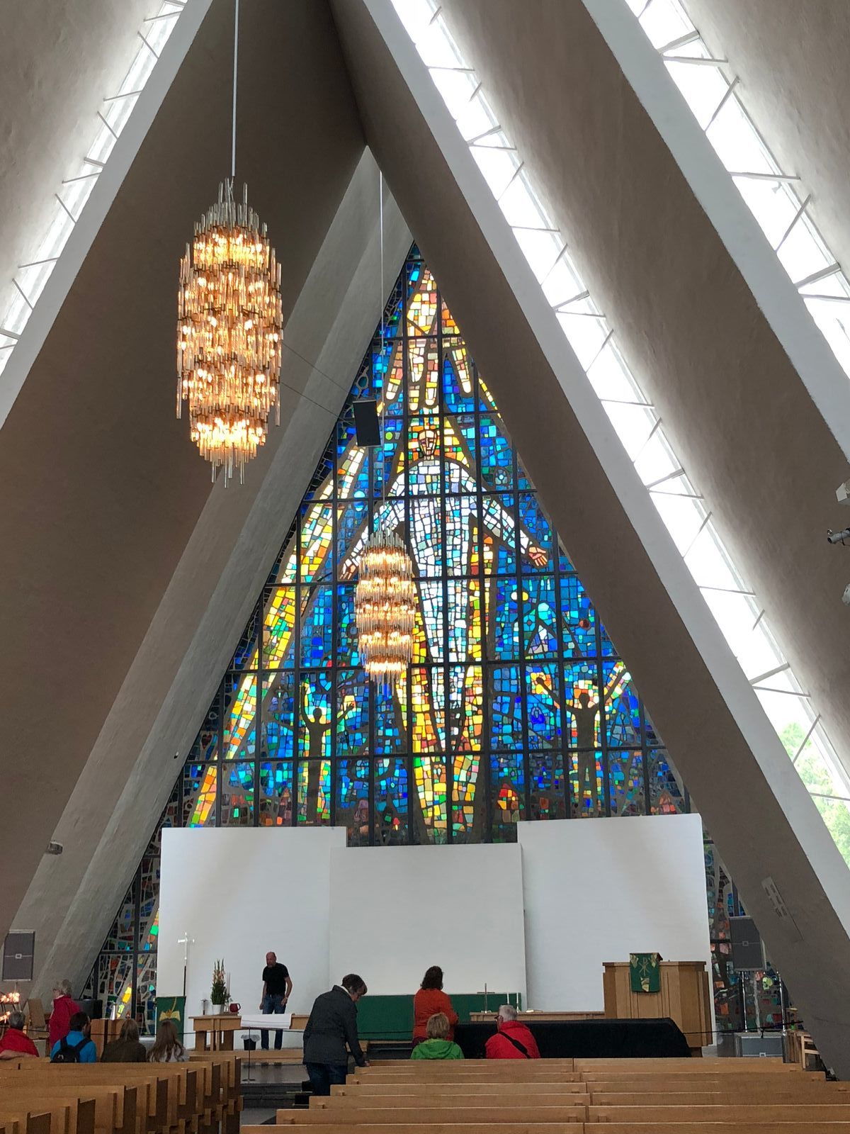 Gegen 12 Uhr besichtigten wir die Eismeerkathedrale für 50 NOK pro Person, das sind gerade mal etwas über 5 €. Eine architektonisch interessante Kirche, deren Dachschrägen bis zum Boden reichen und wie aufgeschichtete Eisplatten wirken. Die Wand hinter dem Altar besteht aus einem 35 Meter hohen Glasmosaik, das wunderschön ist.