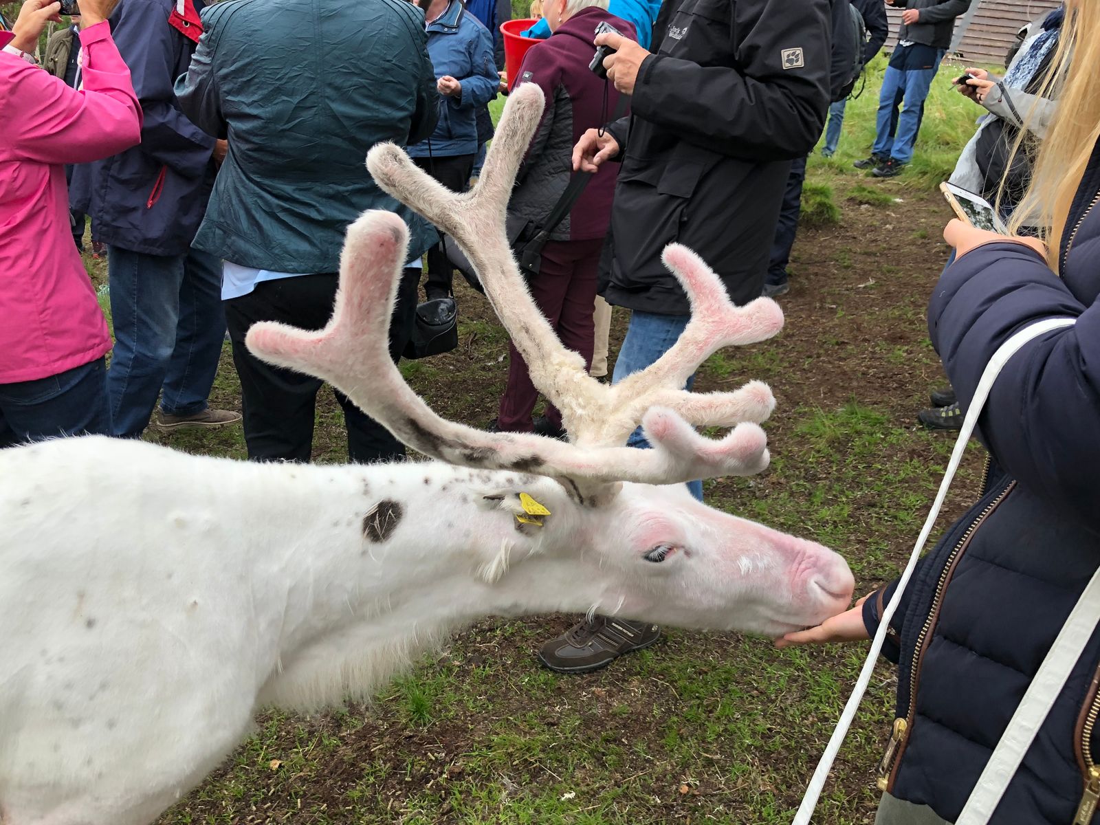 Nach einer halben/Dreiviertelstunde durfte dann jeder, der wollte (wir wollten natürlich), Rentiere füttern und streicheln. Das war ein tolles Erlebnis und auch den anderen Teilnehmern schien es zu gefallen. Der Hausherr selbst hat uns angeleitet. Die Familie ist sehr nett und sympathisch. Es war ein gelungener Ausflug, die Zeit verging wie im Flug und bald fuhren wir wieder zurück.