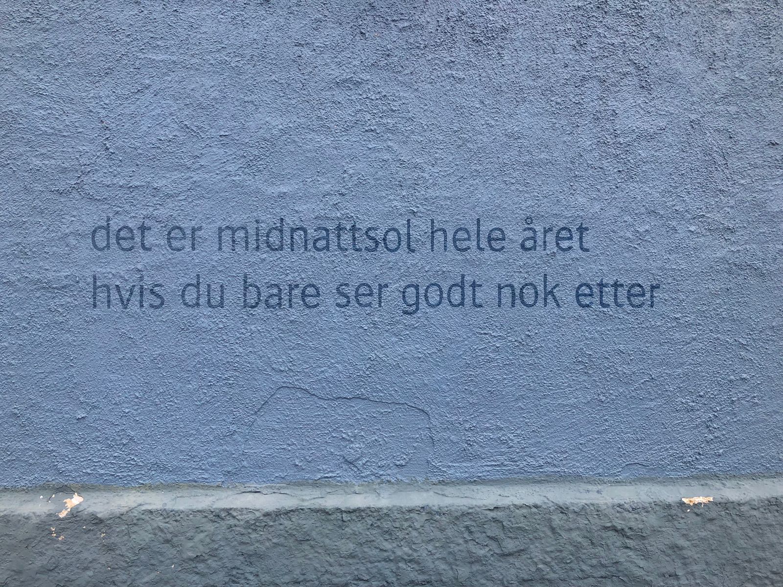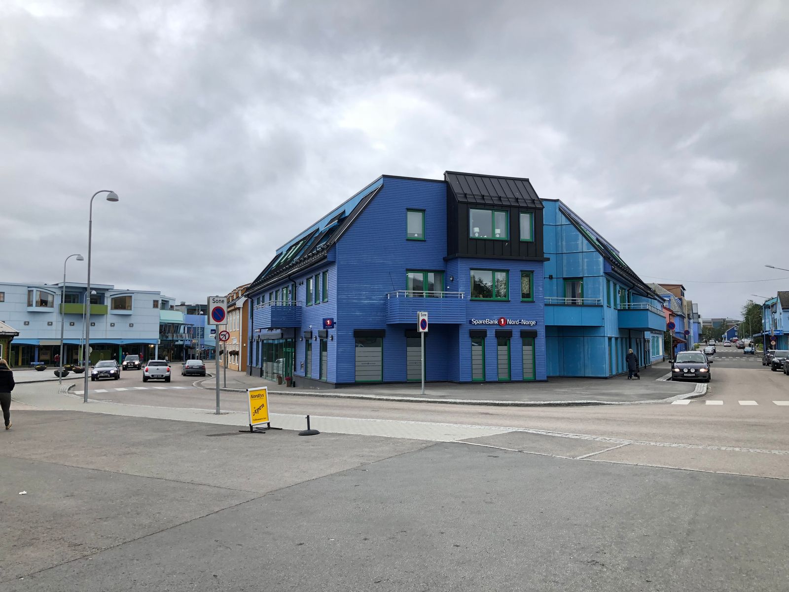 Da wir bereits gegen 11 Uhr wieder im Hafen waren und unser 2. Ausflug erst um 12.45 Uhr begann, sind wir, ohne auf das Schiff zurückzukehren, zu Fuß in die Stadt. Der Fußweg dauert nur etwa 5 Minuten. Hier sahen wir dann auch, warum Sortland die „blaue Stadt“ heißt. Bei einem Kunstprojekt um die Jahrtausendwende wurden mehrere Gebäude in verschiedenen Blauschattierungen gestrichen, um ein einheitliches Bild abzugeben.