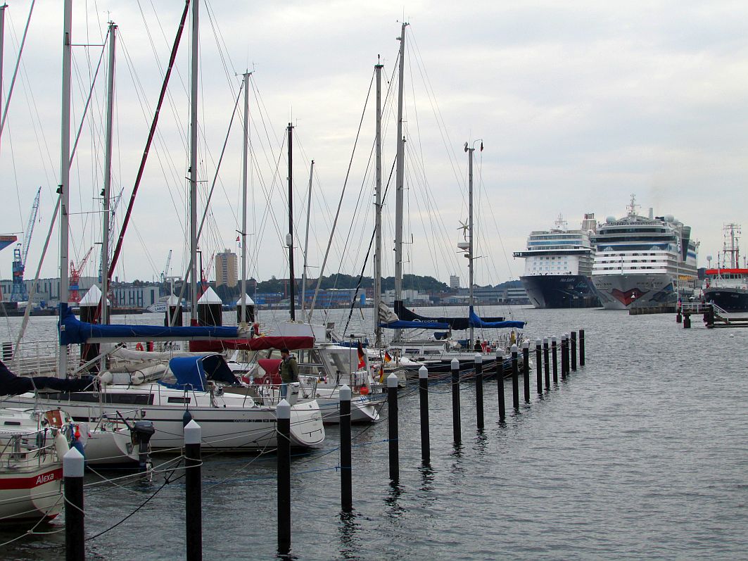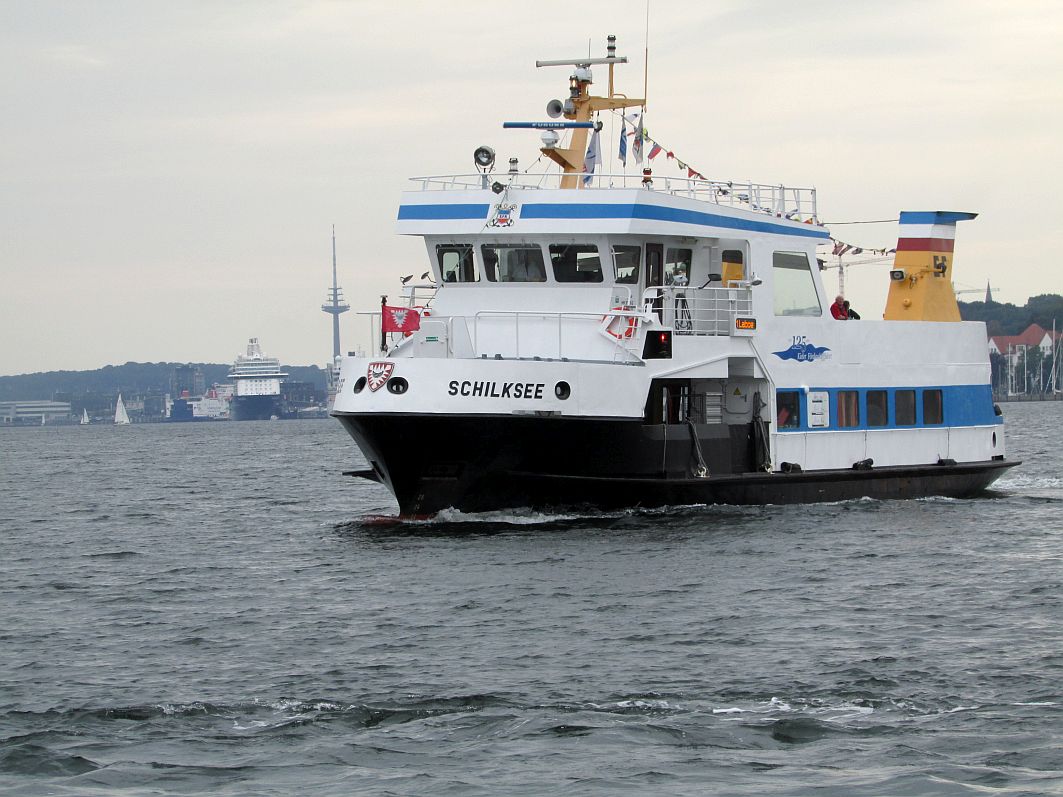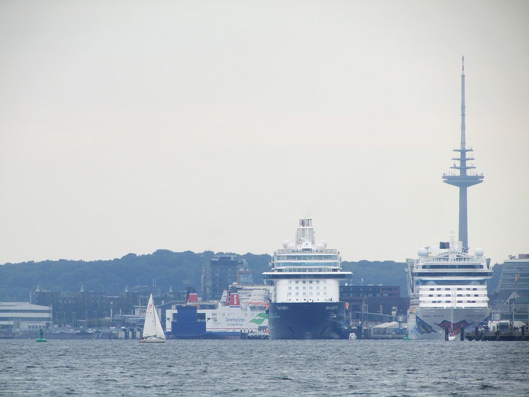 Wer Mönkeberg passiert, der ist letztlich auch schon fast wieder in Kiel, wie mir ein Blick in Fahrtrichtung zeigt: Die „Schilksee“, einer der vielen Fördedampfer, die die Ufer-Orte anfahren, kommt uns entgegen, verdeckt mit ihrem Rumpf den Blick auf AIDAbella, scheint mit ihrem Bug den knapp 227 Meter hohen Fernmeldeturm umstoßen zu wollen, doch lässt den Blick auf „Mein Schiff 4“ noch frei.