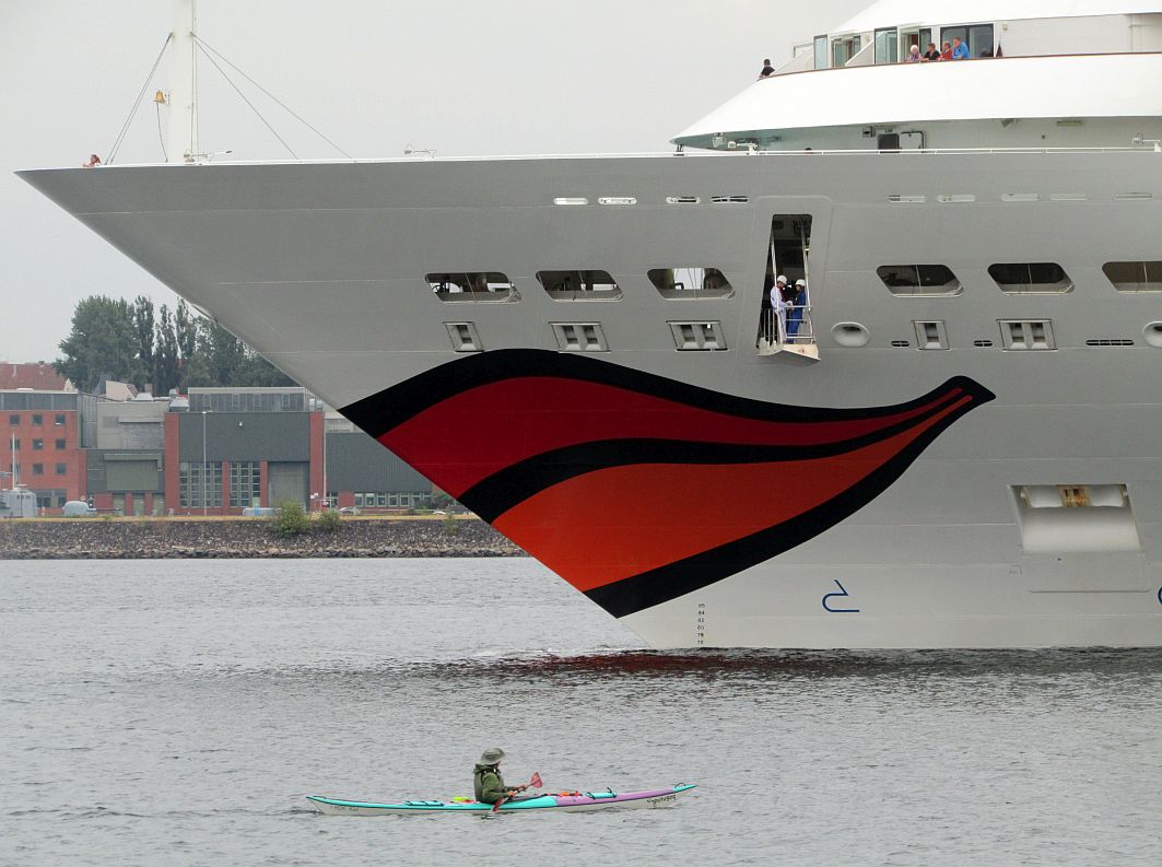 Ich schaue ihr nach, bis sie um die Fördebiegung verschwunden ist und widme mich daraufhin wieder den kuschelnden Kreuzfahrtschiffen, denen ich noch ein Stück entgegengehe. Ein imposanter Anblick, der das Herz jedes Schiffsfans höherschlagen lässt. So natürlich auch meines: