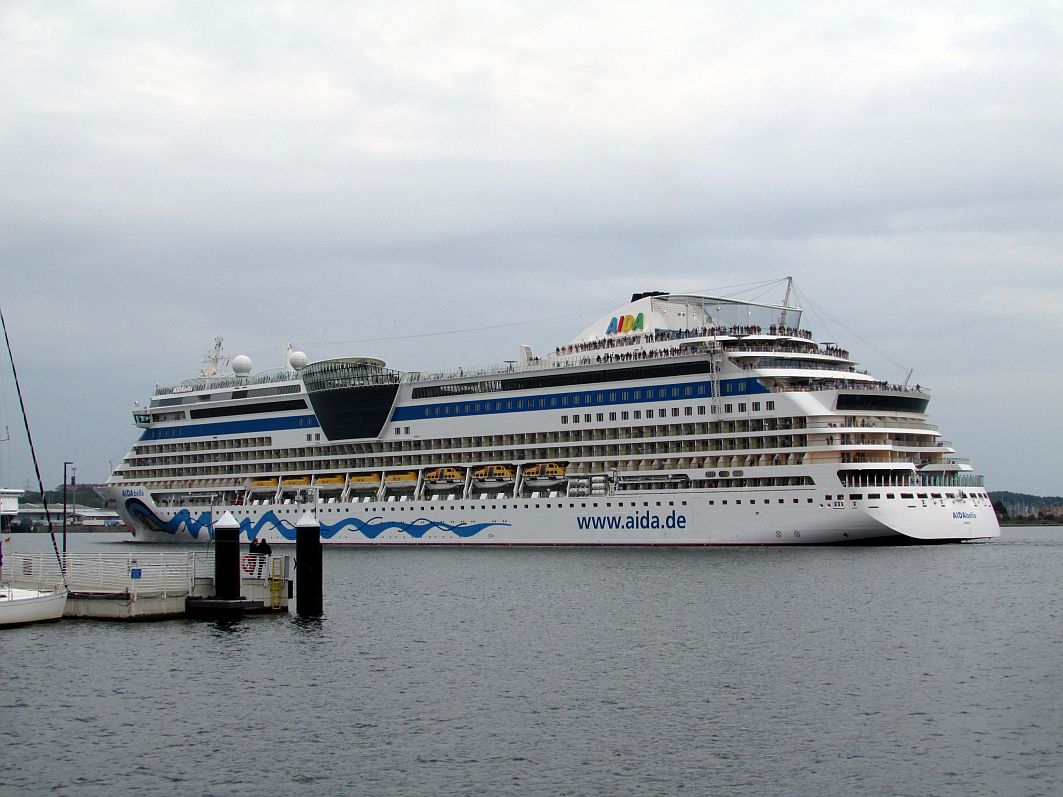 Nahezu majestätisch zieht das schöne Schiff zeitlupengleich an mir vorbei und wird kleiner und kleiner. Soll ich noch schnell ins Wasser springen und ihm hinterherschwimmen?! Nun, ich denke, das würde wenig bringen. Ich könnte es niemals einholen. Und sicherlich ist auch der „Bella“-Kapitän genauso wie unser Kapitän Tidow penibel darauf bedacht, dass die „Reisegruppe“ von rund 3.000 „Mitgliedern“ unter sich bleibt. Also bleiben einmal mehr nur das Winken und Traurigsein. Und so muss ich AIDAbella ziehen lassen … Schweren Herzens … Und dann ist da noch der Gedanke, dass dies das letzte Kussmundschiff meines Urlaubs war. Morgen wird AIDA nicht in Kiel anlegen.