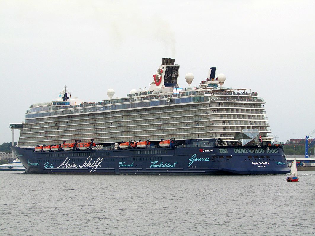 Kurz nach 19:00 Uhr lässt auch der TUI-Kapitän das Typhon tönen. Lautlos gleitet der blaue-weiße Riese vorbei.