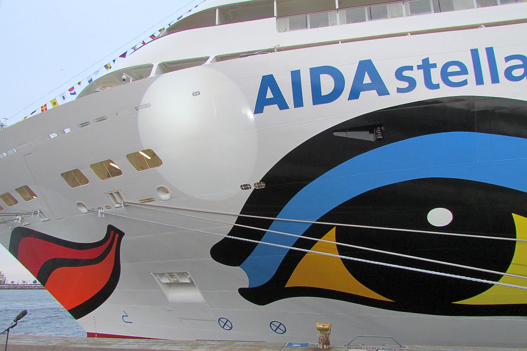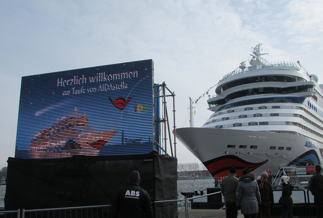 Schön ist sie, AIDAstella, wie sie so an der Pier lag und im Licht des schwindenden Tages immer mehr im Glanz ihrer Lichter erstrahlte. Die Spots wurden schon mal getestet, damit der Platz neben dem Anfangs-„A“ auf der Backbordseite beim Zerschellen der Flasche auch ja ins richtige Licht getaucht ist. Wie war das?! „Die 5 Liter-Flasche feinsten Champagners wurde in den letzten Tagen in der Kapitänskabine zwischengelagert. Mal sehen, ob sie noch ganz voll ist ...“ So die Worte des Moderators, die garantiert nicht die seemännische Wirklichkeit widerspiegelten und die ich in diesem Moment auch ziemlich daneben fand.