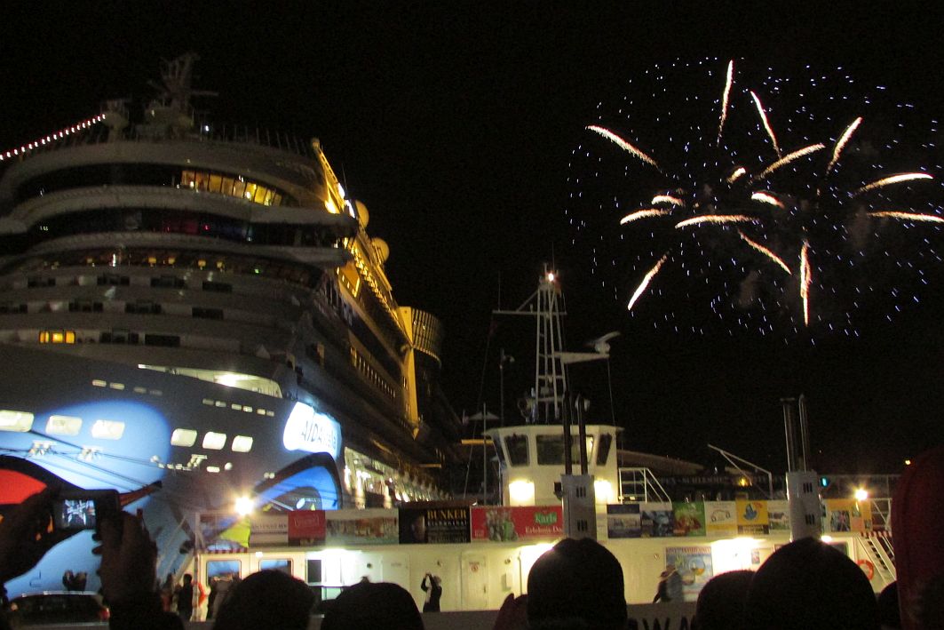 Ein rund 10minütiges Feuerwerk ließ daraufhin AIDAstella in der Eis-Nacht von Warnemünde noch mehr in ihrem Glanz erstrahlen. Leider wurde das Feuerwerk an zwei verschiedenen Standorten gestartet, so dass man je nach Standort unter Umständen leider nur eines genießen konnte. Fontänen aus Tausenden Sternen stiegen in den schwarzen Himmel. AIDAstella war getauft. Und somit erstrahlte ein Stern mehr am Nachthimmel des romantischen Ostseebades Warnemünde.