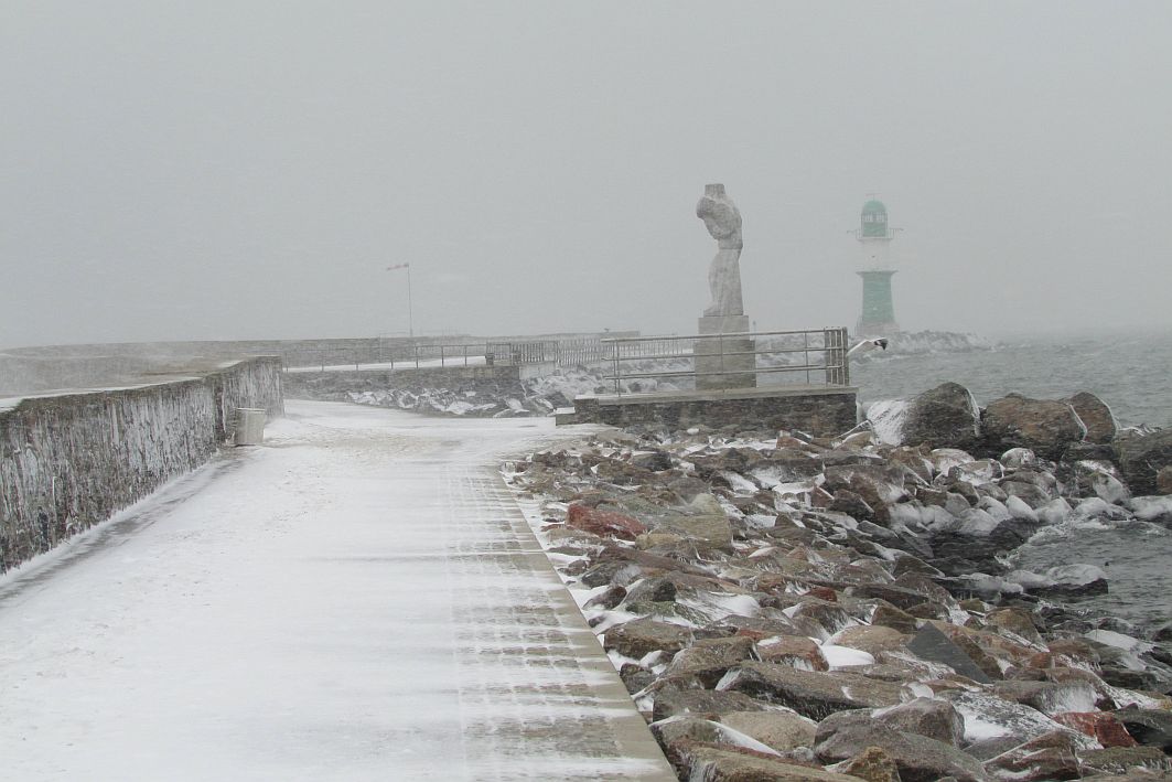 Teepott und Alter Leuchtturm verschwammen schon im Schneegestöber, das Hotel „Neptun“ war nur noch ein ganz undeutlicher Fleck. Tauchte am Samstagmorgen AIDAstella wie eine Fata Morgana am Horizont auf, so war es heute der grün-weiße Leuchtturm der Westmole.