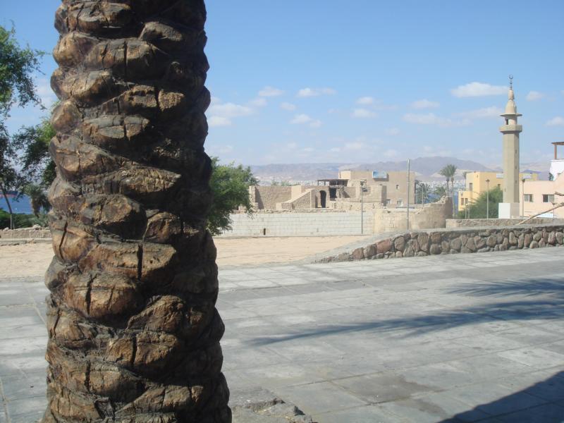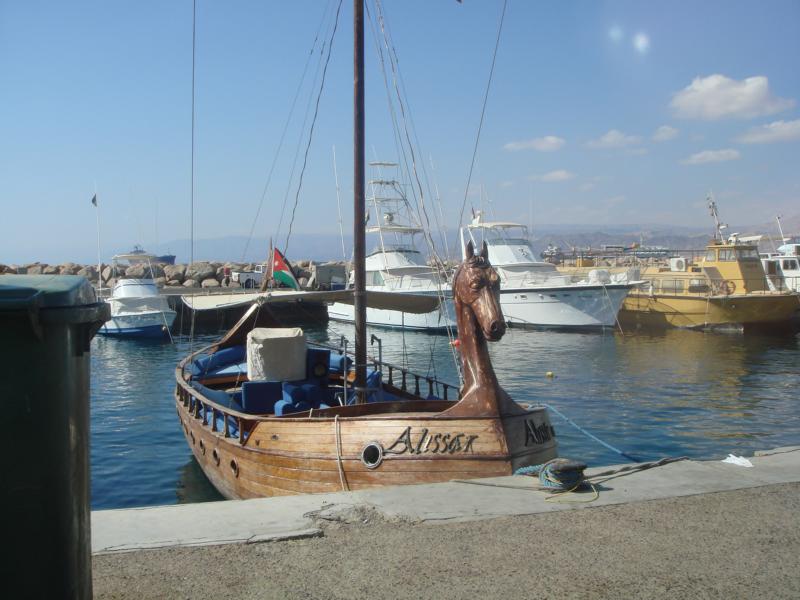 Und wie wir da so gemütlich unter hohen Palmen herumschlendern höre ich, wie zwei deutsche Ehepaare sich mit einem Taxifahrer unterhalten. Es geht um eine Stadtrundfahrt. Die Männer haben keine Lust zu fahren, die Frauen möchten gerne. Ich frage ganz höflich, ob wir da nicht mitfahren könnten. Beziehungsweise Mutti stupste mich vorher an und meinte, sie hätte keine Lust auf Tee jetzt und will lieber was sehen. Ich verhandelte mit dem Fahrer und der Preis war recht akzeptabel, 1 Stunde herumfahren, pro Person 10 Euro. Die Männer entfernen sich und der Taxifahrer freut sich; er unterwegs mit 4 Frauen und ab geht es durch Aqaba. Ich muss ehrlich gestehen, eine ansehnliche Stadt. Gepflegt, sauber, schöne Hotels, eine tolle Strandpromenade und erstaunlich wenig Urlauber unterwegs. Ich glaube, weil er uns sympathisch findet, fährt er kurz in den kleinen privaten Jachthafen rein, damit wir ihn gesehen haben. Er hätte einen guten Freund dort und deshalb ist es kein Problem mit der Einfahrt.