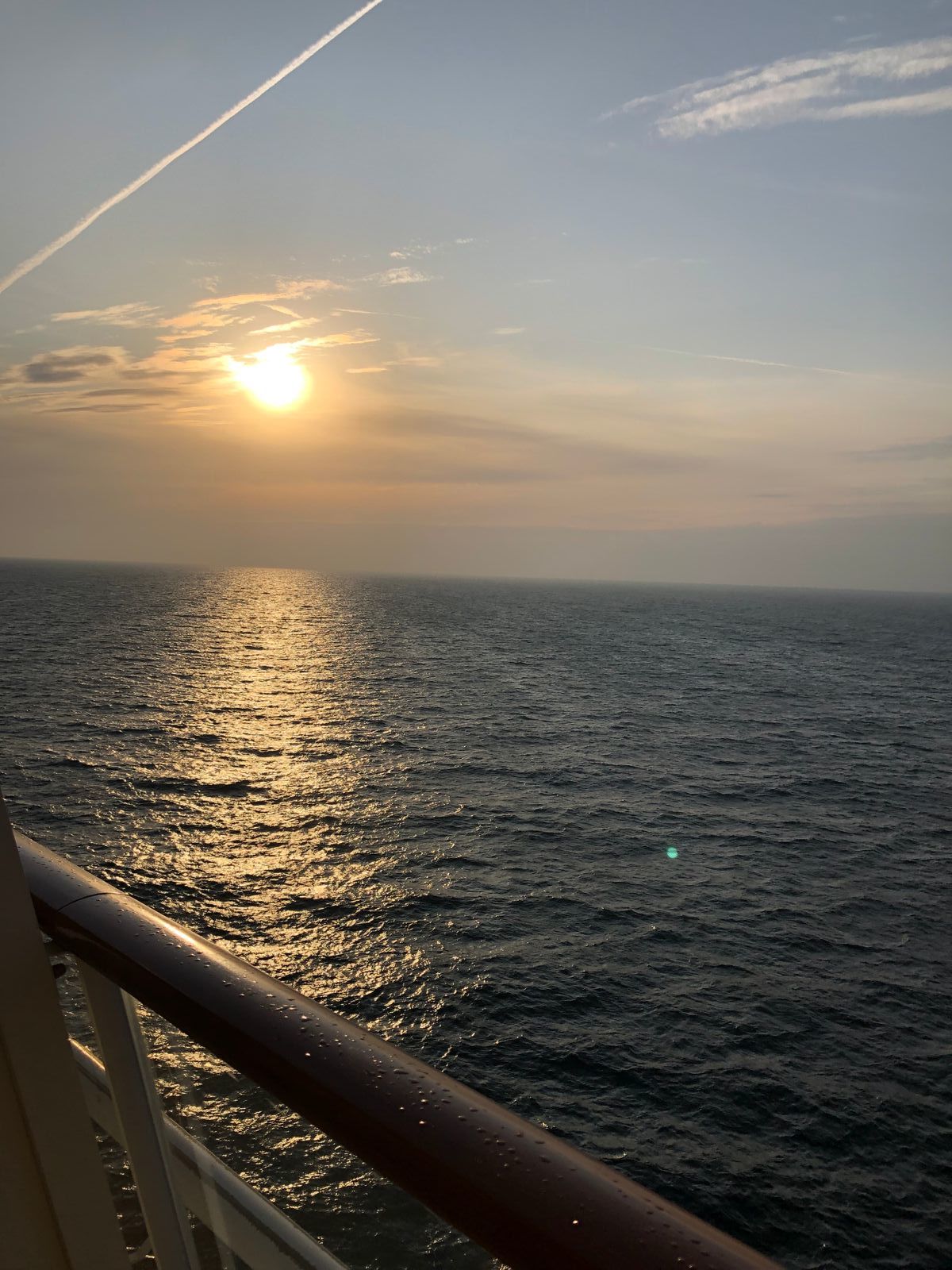 In der Nacht wurden die Uhren von 2 Uhr auf 3 Uhr um eine Stunde vorgestellt, sodass wir den Seetag mit einer Stunde weniger Schlaf begannen. Nach dem Aufwachen ging der erste Blick nach draußen auf’s Meer. Hach, ein wunderbarer Sonnenaufgang. So kann der Tag beginnen.