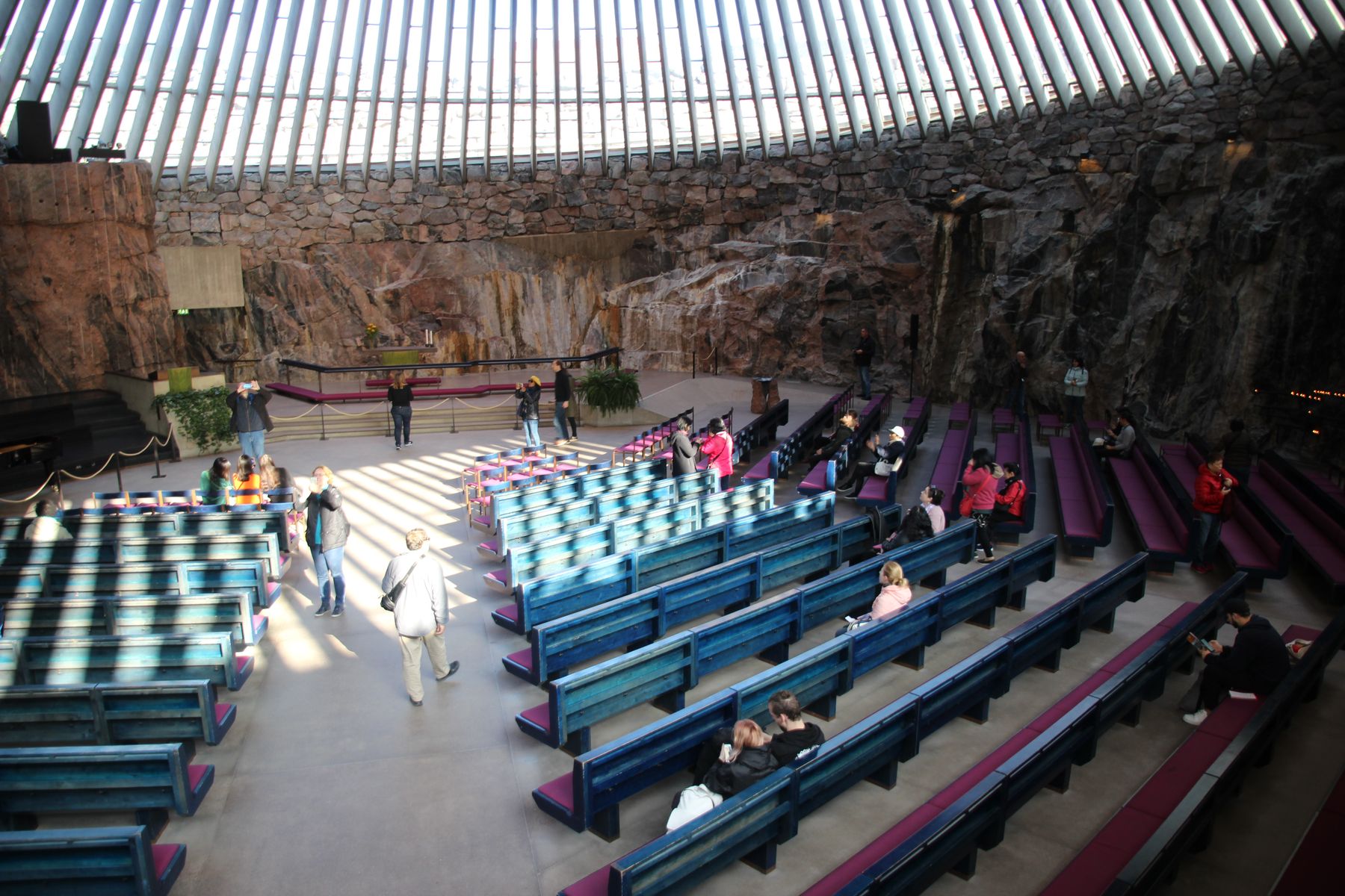 Bei der Innenbesichtigung sahen wir die moderne und etwas spartanische Einrichtung, der Fels liegt an den Wänden frei. Wir erlebten dann noch das „Konzert“ eines Flügelspielers – die Kirche hat eine erstaunliche Akustik, es passte irgendwie alles.
