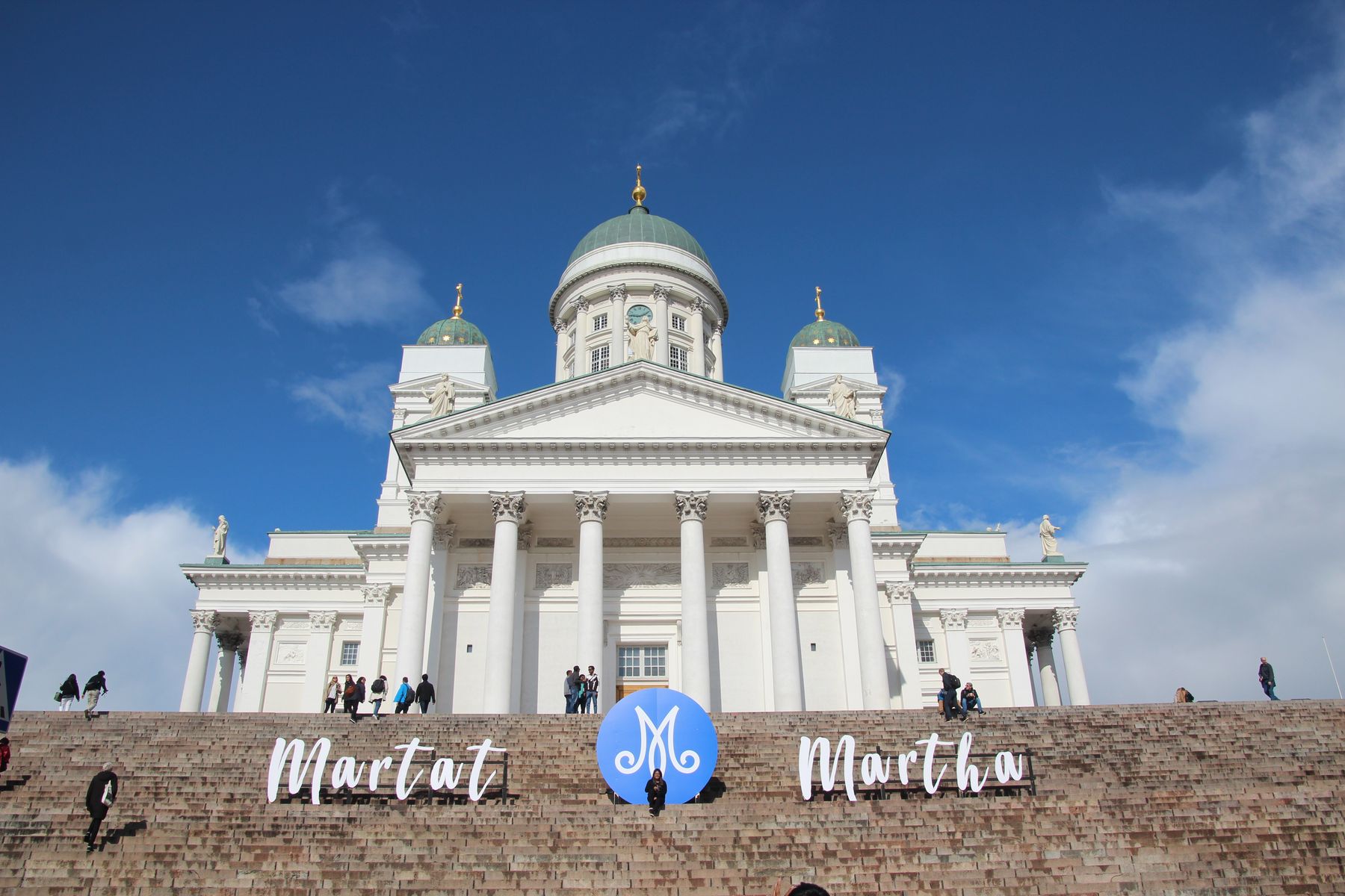 Mit dem Linienbus fuhren wir nun in Helsinkis Innenstadt. Auf der etwa 20-minütigen Fahrt kamen wir an Wohngebieten als auch den Verkehrsknotenpunkten der Innenstadt vorbei. Es war heute wechselnd bewölkt, mal stärker, mal überwog der Sonnenschein und blauer Himmel. Über die Esplanade spazierten wir zum zentralen Senatsplatz, der umschlossen wird vom Regierungspalais, der Universität und dem in Weiß strahlenden Dom. Da an diesem Tag ein Fest stattfand, waren auf dem gesamten Senatsplatz Zelte gestellt, sodass wir dessen weitläufige Dimensionen nur erahnen konnten. Wir erklommen dann erstmal die vielen Stufen der breiten Freitreppe zum Dom und besichtigten diesen. Allerdings waren wir – gerade nach den pompösen Gotteshäusern in St. Petersburg – etwas enttäuscht. Der Dom ist relativ klein und wirkt sehr karg und schlicht eingerichtet. Wir verweilten jedoch im Dom und kamen so wieder in den Genuss eines kurzen Orgelkonzertes.