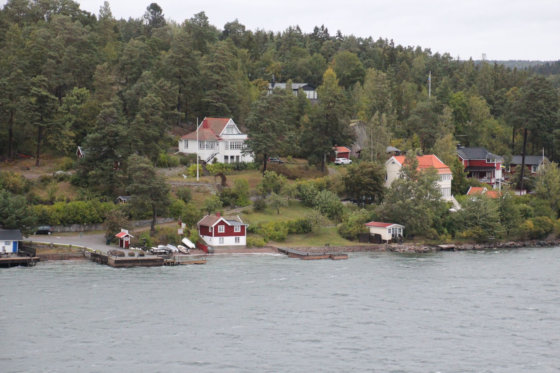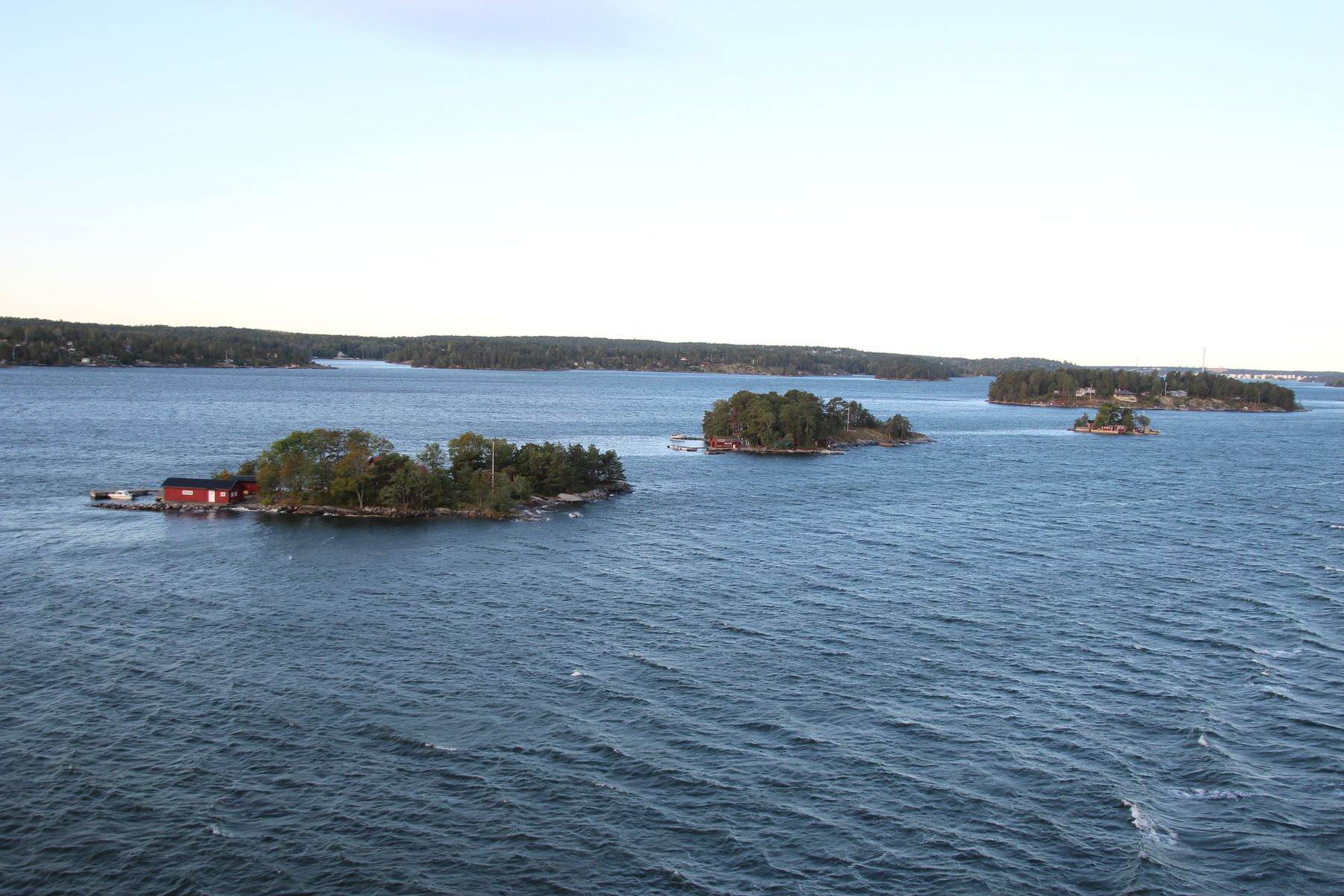 In der Nacht wurden die Uhren von 3 Uhr um eine Stunde auf 2 Uhr zurückgestellt. Aufgrund des starken Verkehrs (Fähren usw.) war nun doch keine frühere Ankunft in Stockholm möglich. Dadurch hatten wir morgens etwas mehr Zeit, bis die Schärenfahrt begann. Die Fahrt durch die Schären war kalt und windig, aber mit einem Kaffee eingemummelt in eine Decke auf dem Balkon war es herrlich. Die kleinen Schären zogen lautlos an uns vorbei, hinter uns sahen wir mehrere Schiffe, die die gleiche Route hatten.