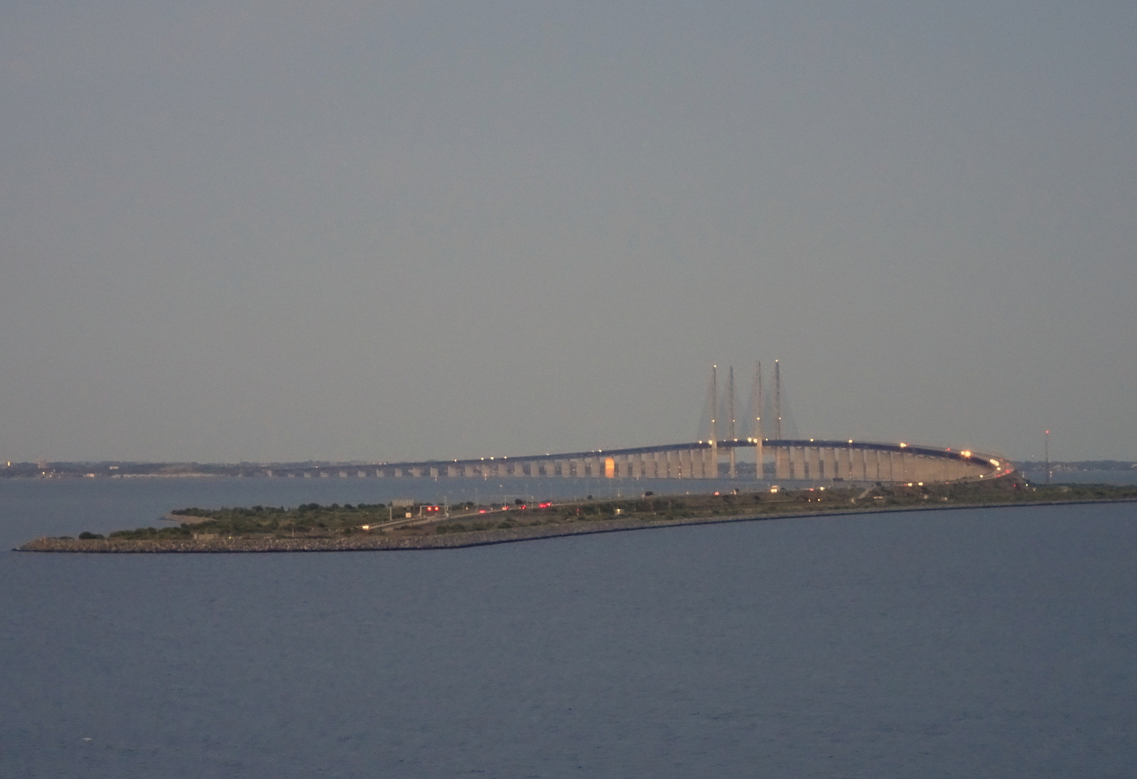 Für die Durchfahrt unter die Brücke sind wir zu groß und vor allem haben wir zu viel Tiefgang. Daher fahren wir über den teuersten Teil dieser aufwändigen Straßen-und Schienenverbindung zwischen dem dänischen Kopenhagen und dem schwedischen Malmö. Irgendwo unter uns ist er jetzt, der Tunnel.