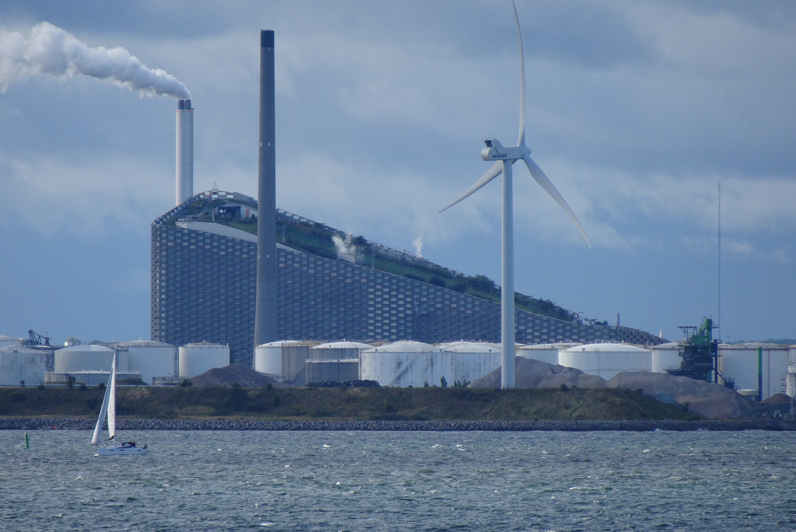 Es ist dieses große schräge Dach der riesigen Müllverbrennungsanlage welches ich nun mal von der anderen Seite sehe. Dabei erkennt man links den Skilift und daneben die „schneesichere“ Skipiste aus Kunststoffmatten. Vereinzelt sind darauf sogar schwungvolle Bewegungen auszumachen.
