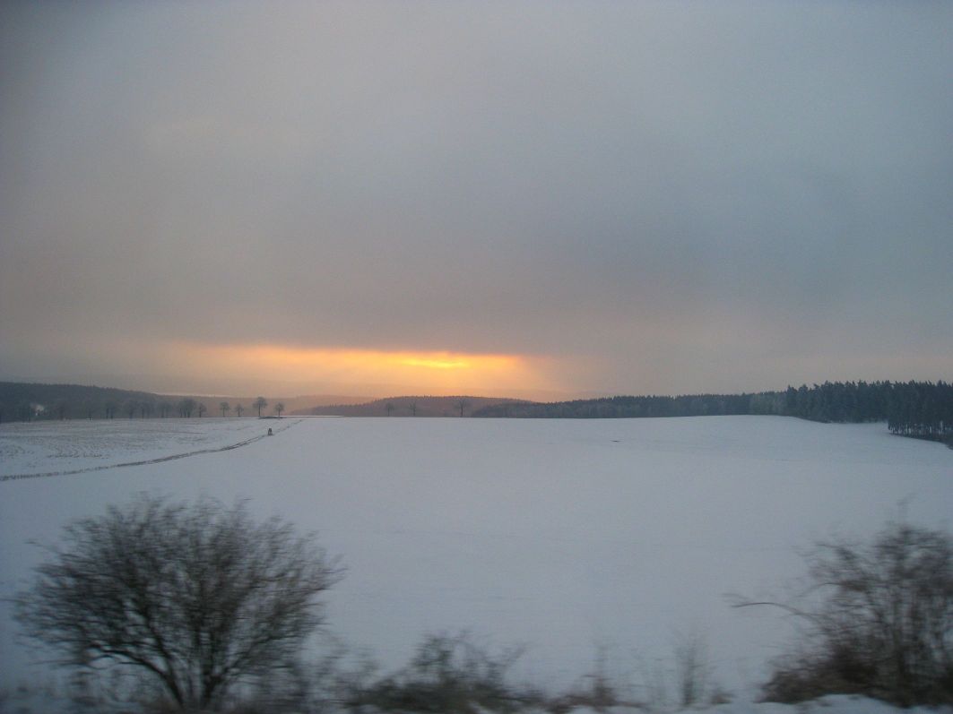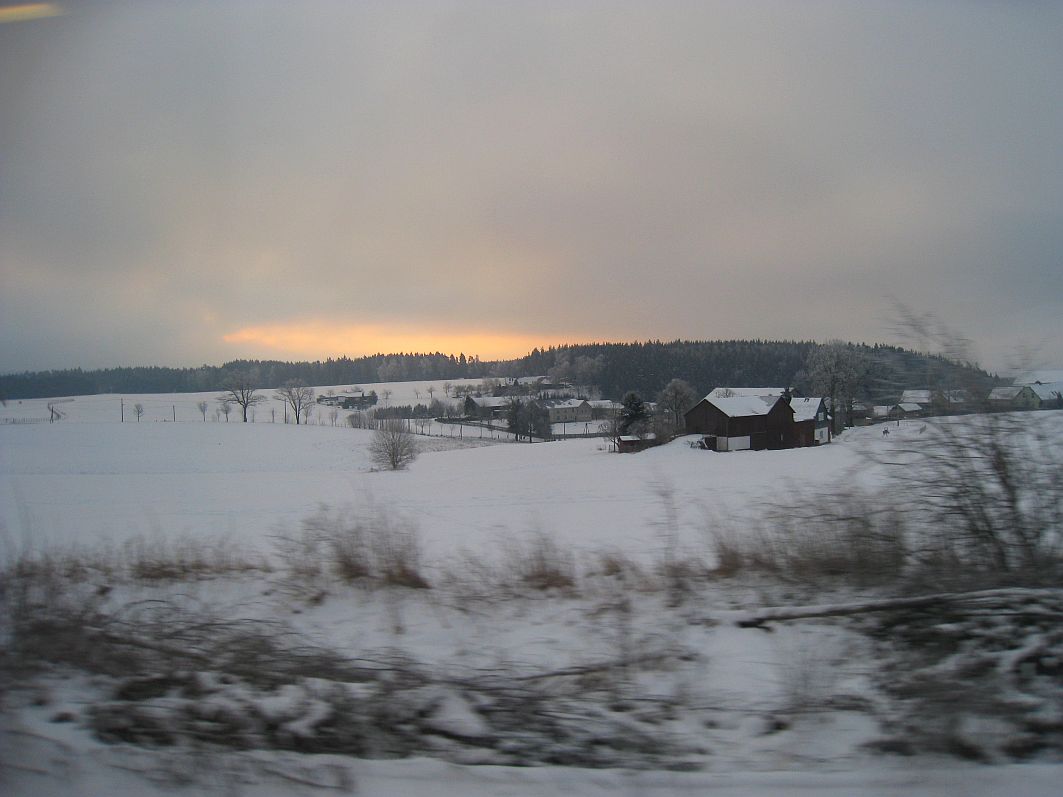 Der Zug ist fast pünktlich und los geht es zunächst in Richtung Nürnberg. Vor den Zugfenstern erwacht der Tag. Selbst der Sonne fällt es schwer, bei dieser Kälte ihre Strahlen durch die Wolken zu schicken.