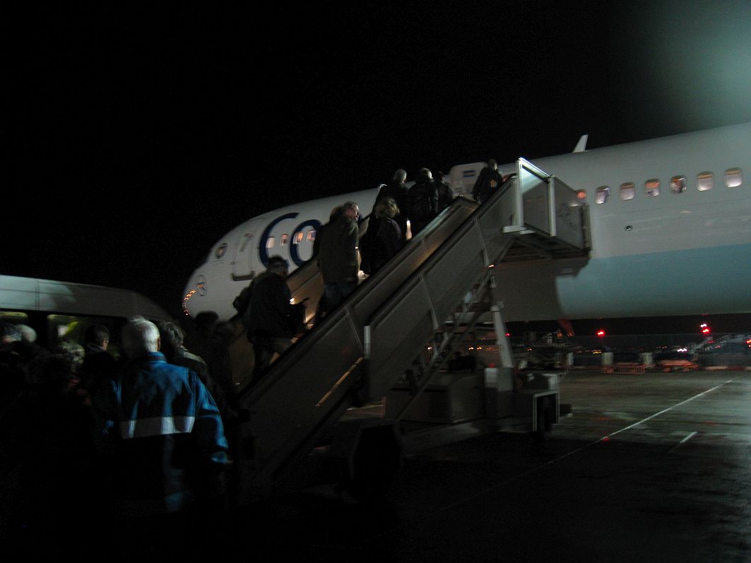 Ein eisiger Wind weht uns entgegen, als wir die Gangway betreten. Und in der Ferne hören wir die Sirenen der Flughafenfeuerwehr, was einigen von uns ein leichtes Stirnrunzeln beschert ...