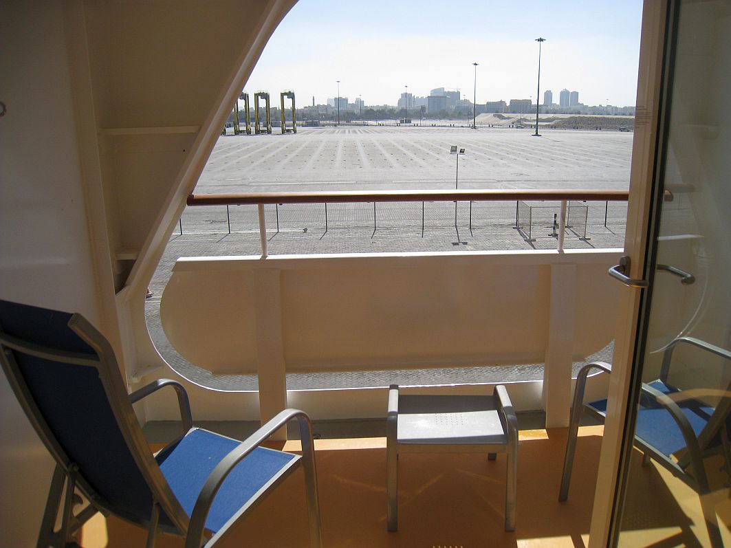 Und auch die Flasche AIDA-Sekt, die ich von zu Hause aus bestellt hatte, stand bereit. Klar, dass ich mich erstmal mit einem Glas AIDA Prestige Cuvee in die Sonne setze, die warme Sonne, die ich in den letzten Tagen und Wochen in Deutschland so vermisst hatte. Die spektakuläre Kulisse Dubais grüßt herüber.