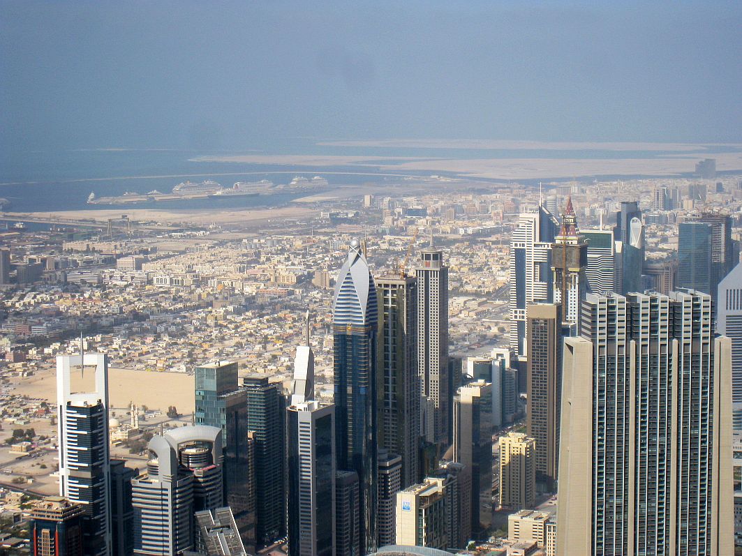 Grandios, wie sich der Schatten des Burj Khalifa tief unter mir auf dem Boden abzeichnet. Und ganz winzig klein ist auch die AIDAblu von hier oben aus zu erkennen. Lediglich in Richtung Burj Al Arab und Jumeirah Beach ist der Blick nicht so besonders, was auch am Sonnenstand liegt.