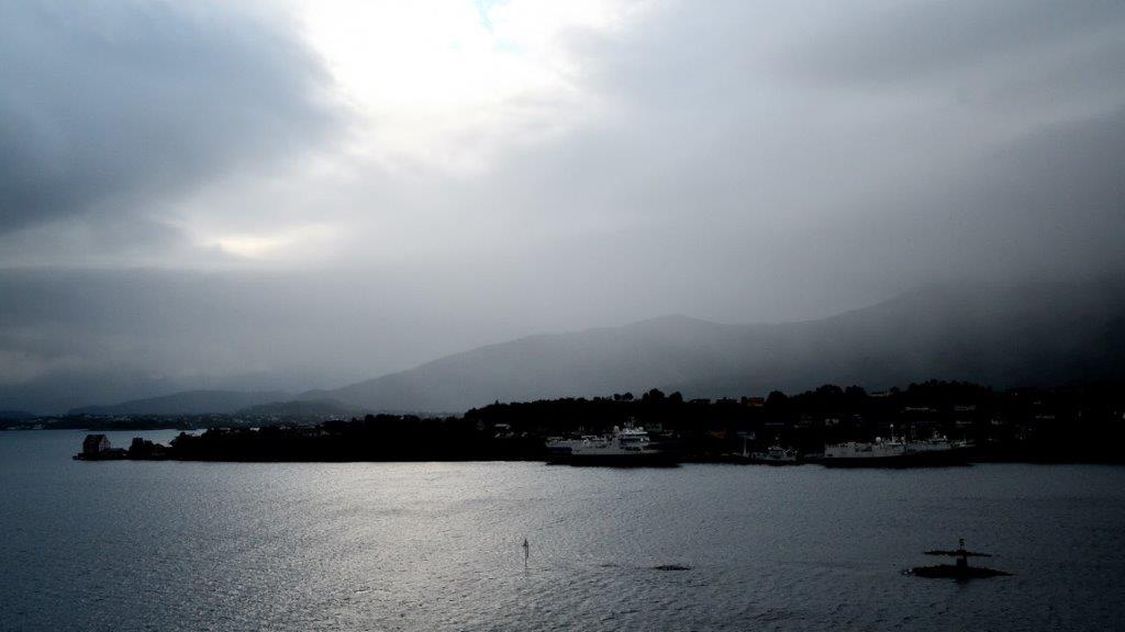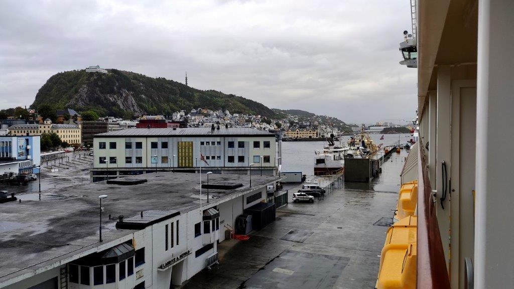 Ich hatte das Anlegen verpennt … Aber das war nicht so schlimm, denn Petrus hatte die normalen Bergen-Verhältnisse auf Ålesund übertragen … Es regnete ein wenig … und das, was ich von der Steuerbordseite aus sah, trug nicht gerade zur Hochstimmung bei …
