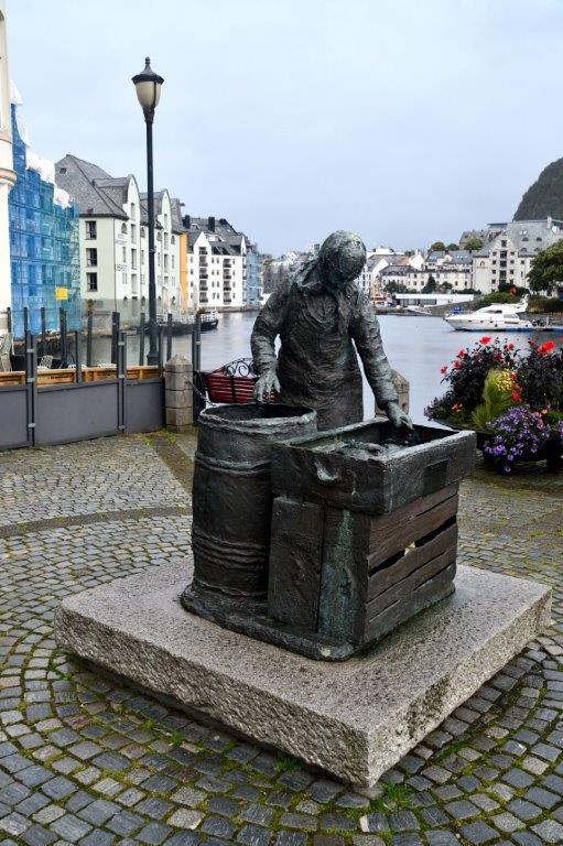 So wie wir an diesem Morgen als Überbrückung der Zeit bis zu unserem Busausflug. Ja, was sollte man in Ålesund unternehmen, wenn man nicht einen Ausflug gebucht hatte oder Zeit bis zum Beginn des Ausflugs hatte? So wie wir … Man sollte auf jeden Fall die im Jugendstil aufgebaute Innenstadt besuchen. Und damit kommen wir zum Thema Katastrophe. Nein, nicht die Innenstadt ist eine Katastrophe – im Gegenteil … Aber am 23. Januar 1904 fiel in einer Margarinefabrik eine Petroleumlampe um. Kleine Ursachen – große Wirkung. Es entstand ein Brand, dem rund 850 fast ausnahmslos aus Holz errichtete Häuser zum Opfer fielen – nahezu die gesamte Innenstadt. 10.000 Menschen wurden obdachlos; zum Glück fiel dem Inferno nur eine Person zum Opfer! Kaiser Wilhelm II. als großer Norwegenliebhaber schickte sofort vier mit Lebensmitteln, Medikamenten und Baumaterialen beladene Schiffe der Reichsmarine als aus eigener Tasche finanzierte Soforthilfe nach Ålesund. Nach dem Entladen dienten die Schiffe einige Zeit als Obdachlosenunterkunft. Weiterhin beorderte der Kaiser deutsche Architekten als zusätzliche Unterstützung in diese damals gebeutelte Stadt; die deutschen Architekten unterstützten ungefähr 50 norwegische Architekten. Alle sorgten dafür, dass nach schon sieben Jahren Aufbauarbeit die Stadt fast vollständig im damals vorherrschenden Jugendstil wiederhergestellt war: Zu erkennen sind heute die Merkmale deutscher Elemente mit eleganten, organischen Linien und Asymmetrien, weiterhin Quadersteinbauten aus der amerikanischen Architektur sowie nationalromantische Details aus dem norwegischen Stabskirchenbau. Wichtig war, dass untersagt wurde, Gebäude aus Holz zu errichten. Die Bürger Ålesunds waren Kaiser Wilhelm so dankbar, dass sie eine Hauptverkehrsstraße, die „Keiser Wilhelms Gate“, nach ihm nannten.