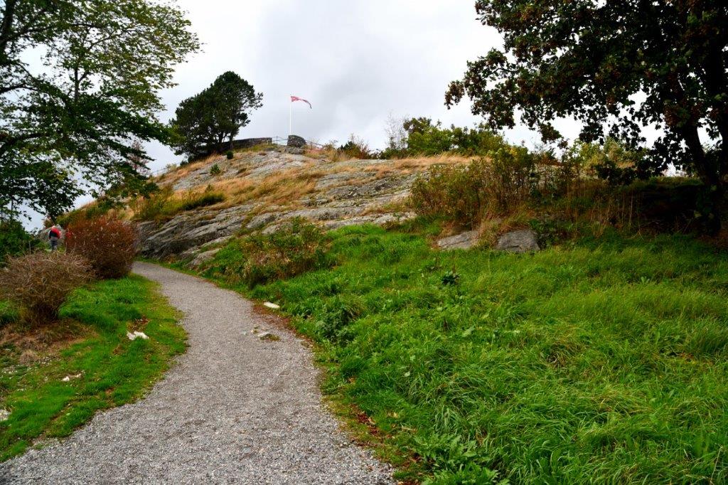 In der Nähe der Kirche wurden wir auf einen Wegweiser aufmerksam. Und neugierig auf „Storhaugen“. Langsam kam die Erinnerung. War das nicht ein Aussichtspunkt? Wir mussten es erkunden und stiefelten weiter.