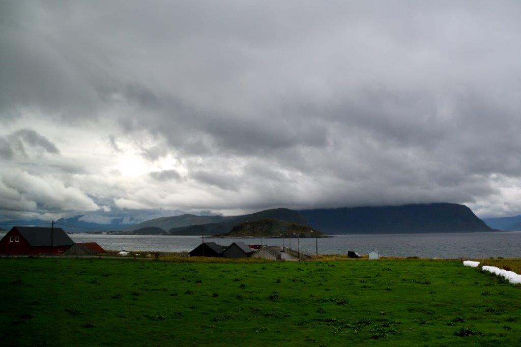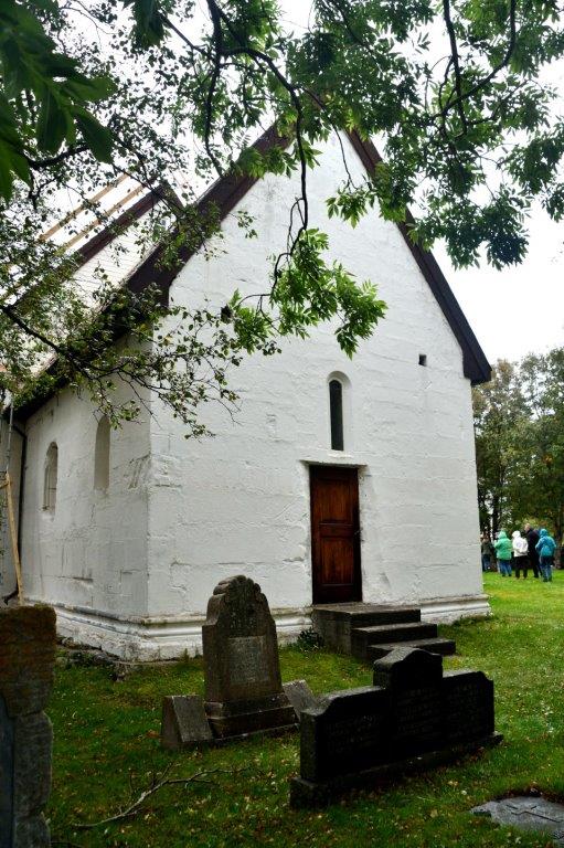 Bei diesem Ausflug wurde es bei der Fünf-Insel-Fahrt immer wieder dunkel. Zum ersten Mal kurze Zeit nach Verlassen der ersten Insel (Nørvøya). Wir fuhren durch den Ellingsøytunnel auf die Insel Ellingsøya. 3.481 m durch die Tunnelröhre und bis zu 140 m unter dem Wasserspiegel. Von Ellingsøya bekamen wir nicht viel mit. Ich kann mich noch an viel Grün erinnern und an langsam, aber stetig einsetzenden Regen. Und schon kam der nächste Tunnel, der 4.222 m lange und bis zu 137 unter dem Meeresspiegel führende Valderøytunnel. Er endete auf der Insel Valderøya. Wir nahmen nicht die Straße zum Ålesunder Flughafen auf der Insel Vigra (nur mit einem „a“!) sondern die, die zur Insel Giske führte. Über eine 552 m lange Brücke. Wir durchquerten die Insel mit dem gleichlautenden Hauptort. Was sahen wir während der Fahrt? Wieder viel Grün, einzeln stehende Häuser und auch kleinere -zusammenballungen. Und an den Busscheiben herunter rinnenden Regen … Oh Wunder, wir mussten uns bei Hans-Werner bedanken! Er hatte zumindest auf der geschichtsträchtigen Insel Giske das richtige Timing! Kaum kamen wir an unserem ersten Ziel, der Giske-Kirche, an, hatte Petrus für einige Minuten ein Einsehen mit uns! Es tröpfelte nur noch von oben mit – echt! – Sekunden langen Regenpausen! Also raus aus dem Bus und auf Richtung Kirchlein!