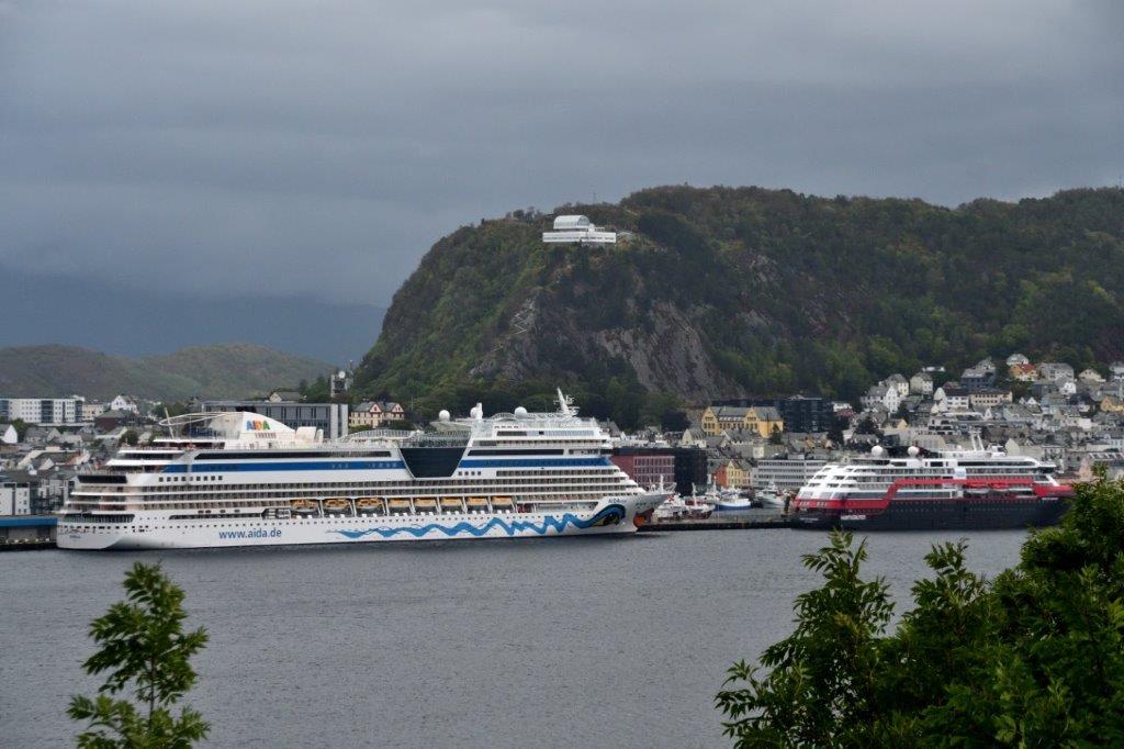Ålesund lag zu unseren Füßen. Eine Augenweide. Ein überwältigender Blick auf die über die zerfranste Küste und auf Inseln verteilte Stadt, das Meer und die Sunnmøre-Alpen. Nach ausgiebigem Bestaunen der Inselwelt näherte sich das Ausflugsende. Schade, aber da noch ein wenig Zeit war, gab es eine Zugabe. Neben einer Stadtrundfahrt wurden eine sechste und siebte Insel angefahren, nämlich die Altstadtinsel Aspøya sowie Heissa als westlichste der vier Stadtinseln. Wir umrundeten die Bucht zwischen der Altstadtinsel und Heissa und machten bei einen Fotostopp gegenüber unserer AIDAmar und der Fridtjof Nansen.
