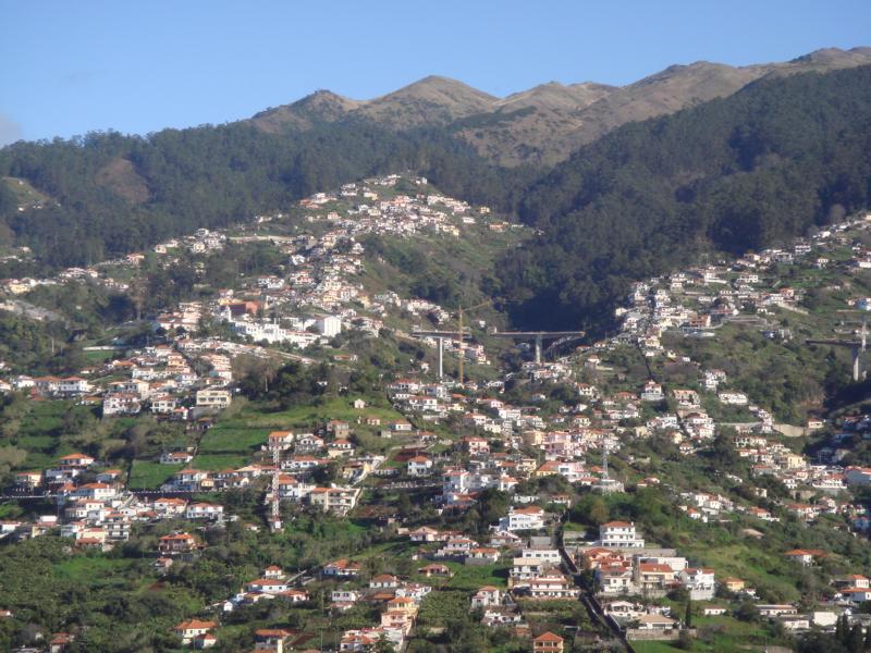 Auch erfuhren wir etwas über den Bananenanbau auf Madeira, dass diese Bananen nur in Portugal verkauft werden dürfen, weil sie nicht der EU-Norm entsprechen, sie sind zu klein. Sorry, für sowas habe ich kein Verständnis. Vom Miradouro Pico Barcelos,355 meter über dem Meeresspiegel, hatten wir eine klare Sicht auf die Küste, aber auch auf der Bergkette hinter uns. Über einige Berge hingen dunkle Wolken, die einen starken Kontrast zum azurblauen Himmel boten. Die Spitze des Bergpasses, zum Eingang ins Tal der Nonnen, war unser nächster Haltepunkt. Vom Eira de Serrado (1053 meter) konnten wir tief ins Tal runterschauen und wer da nicht Schwindelfrei ist, sollte lieber die Augen auf die Berge richten.