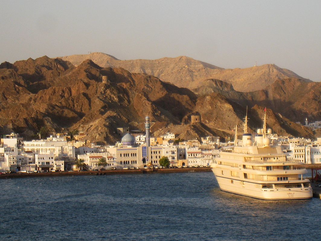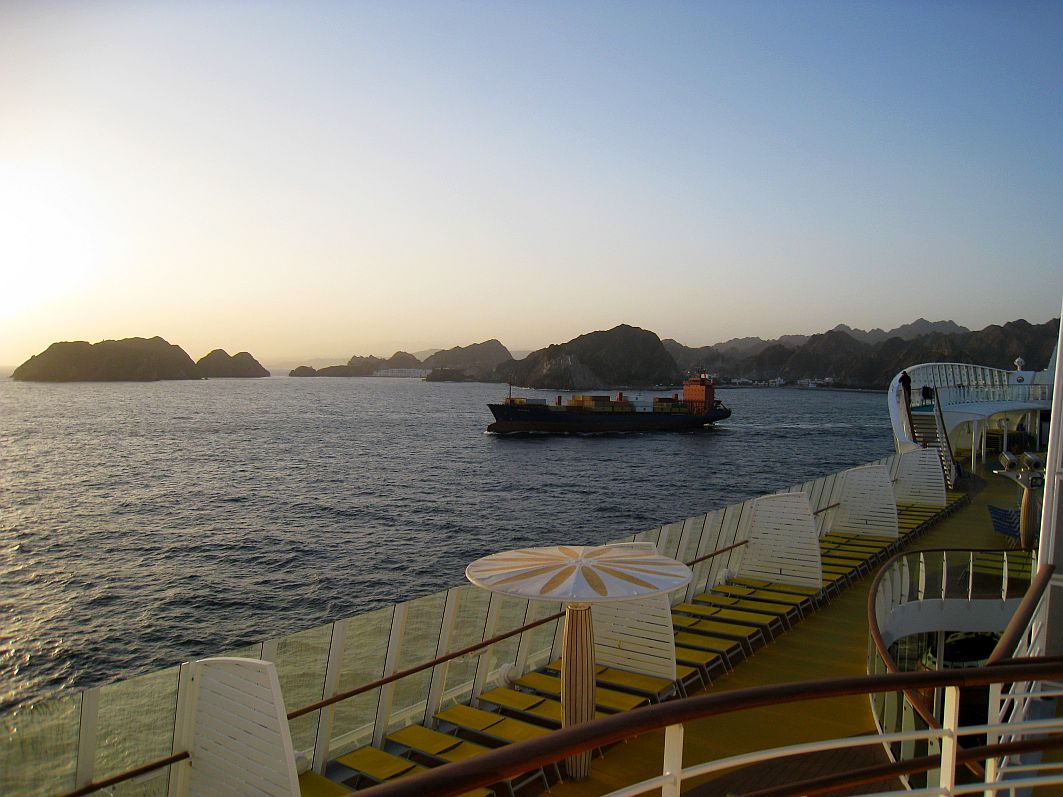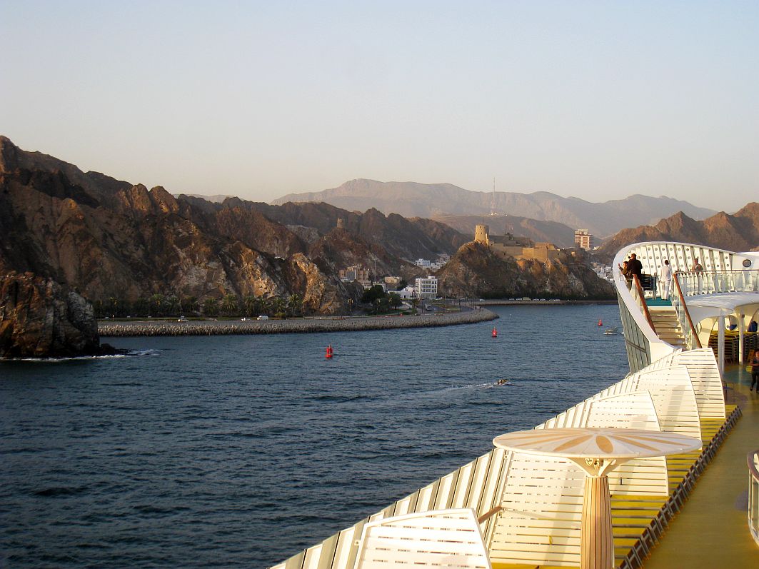 Die Kulisse, die sich uns beim Einlaufen in den Hafen von Muscat bietet, ist atemberaubend schön. Das Hafengelände scheint sich perfekt in die Landschaft zu integrieren. Ich stehe an der Reling, kann kaum glauben, welch mystische Landschaft vor meinen Augen vorbeizieht und gerate regelrecht ins Schwärmen.