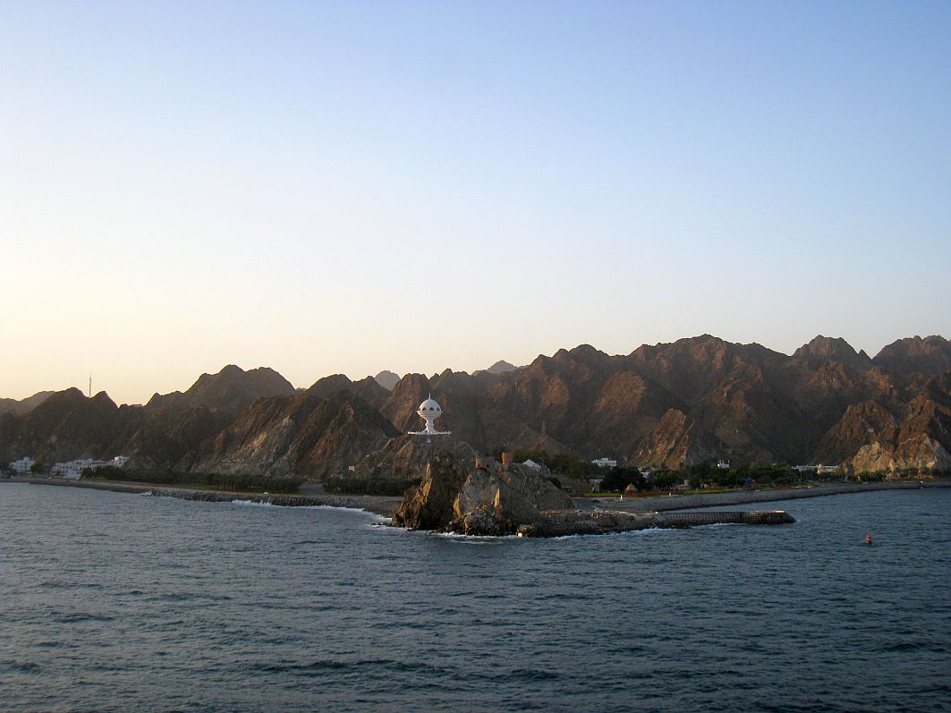 Und da ist er auch schon winzig klein wie eine Ameise als weißer Fleck vor den braunen Felsen zu erkennen: der über der Hafeneinfahrt von Muscat thronende Weihrauchbrenner, von dem ich schon gelesen habe. Jenes beliebte Fotomotiv, das ich schon so oft auf Fotos gesehen habe und nun endlich mit eigenen Augen aus nächster Nähe betrachten kann.