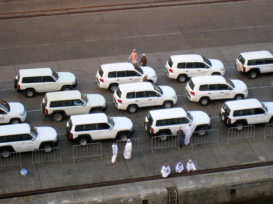 Um 9 Uhr treffen wir Gäste uns zum Ausflug „MUS 03: Fischmarkt, Nakhl und Souk von Muttrah“. Als wir das Schiff verlassen, bekommen wir rosafarbene Landgangskarten, die uns zum Verlassen und Wiederbetreten des Hafens autorisieren. Am Bus wartet schon Reiseleiterin Daniela aus Innsbruck mit Fahrer Achmed Bin Ali. Wir verlassen das Gelände des Sultan Qaboos Port.