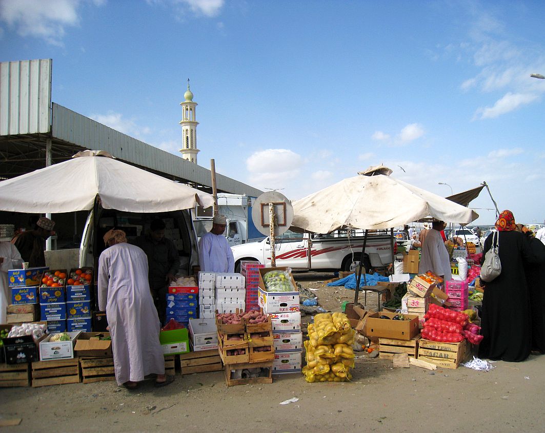 Nach rund einer Stunde und nachdem wir am Straßenrand etliche Ziegen und sogar zwei Dromedare passiert haben, erreichen wir den Küstenort Barka direkt am Golf von Oman und tauchen ein in eine völlig fremdartige aber interessante und unglaublich bunte Welt: Obst- und Gemüsestände, fangfrischer Fisch, der lautstark gehandelt und für den besten Preis an den Mann gebracht wird. Ein Ort wie aus einem Märchen aus 1000 und einer Nacht.