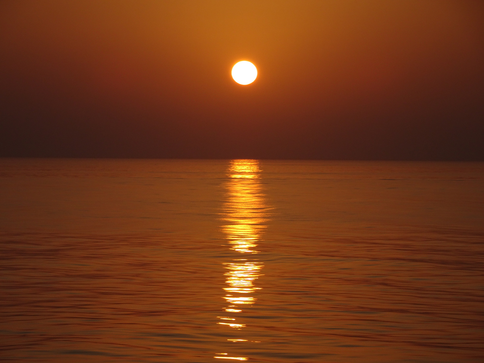 Die orientalische Sonne wirft von oben über 30 Grad auf uns nieder und von unten, also vom Wasser her, strahlen 31,5 Grad nach oben. Wir sind bei diesem Sandwich in der Mitte.