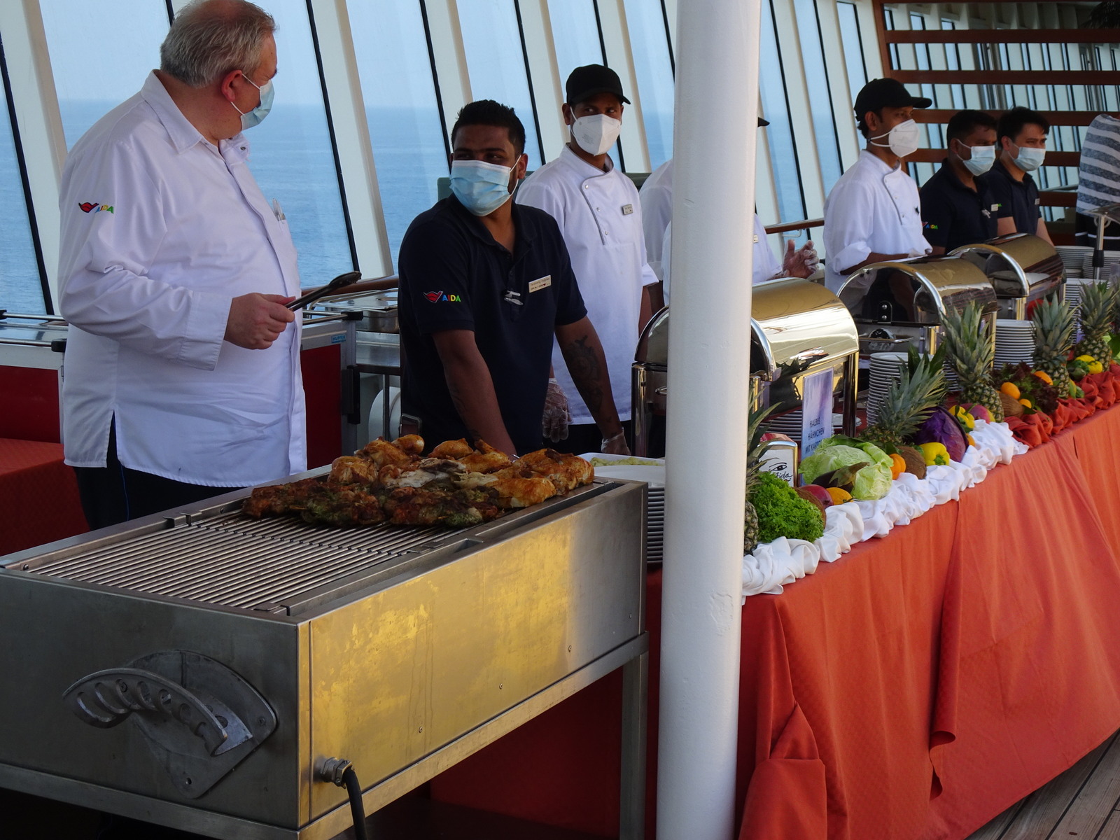 Lediglich die „Liegenpiraten“ haben sich ja schon lange vor Erreichen der „High-Risk-Area“ eingeschlichen und führen ihr Regiment. Der Wind gestaltet die Lage auf dem Sonnendeck und selbst dem FKK-Deck aber heute etwas entspannter. Einige Handtücher sind durchgemischt und für den Rest sorgen 2 Arbeiter, welche die Liegen dort oben wegen diesem Wind erstmal wieder weitgehend wegräumen. Offenbar glauben sie nicht daran, dass hier heute noch sonnenhungrige Touristen dem Wind trotzen. Das schafft Platz und Raum für unsere Leute, welche kurz danach dort die Showbühne betreten.