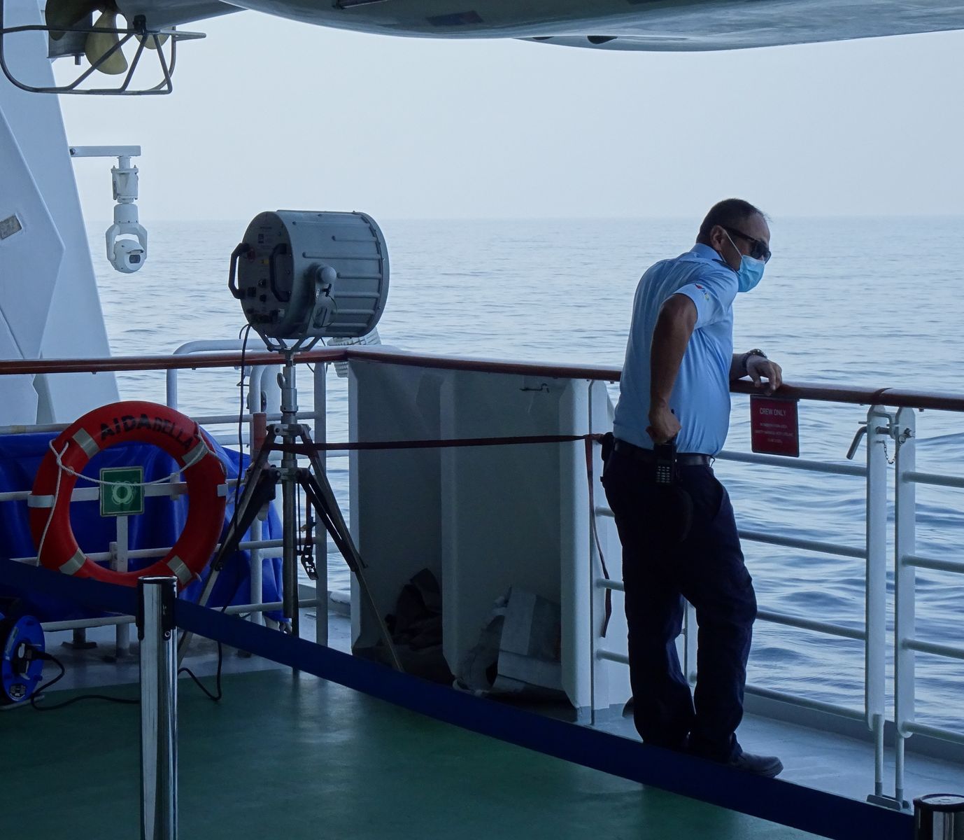 Dazu kommt der Fahrtwind, wir rauschen extra mit fetten 20 Knoten auf einer festgelegten Konvoi-Fahrspur durch den Golf, denn spätestens jetzt befinden wir uns in der sogenannten „High Risk Area“. Steuerbords zwar nicht zu sehen, liegt Somalia.