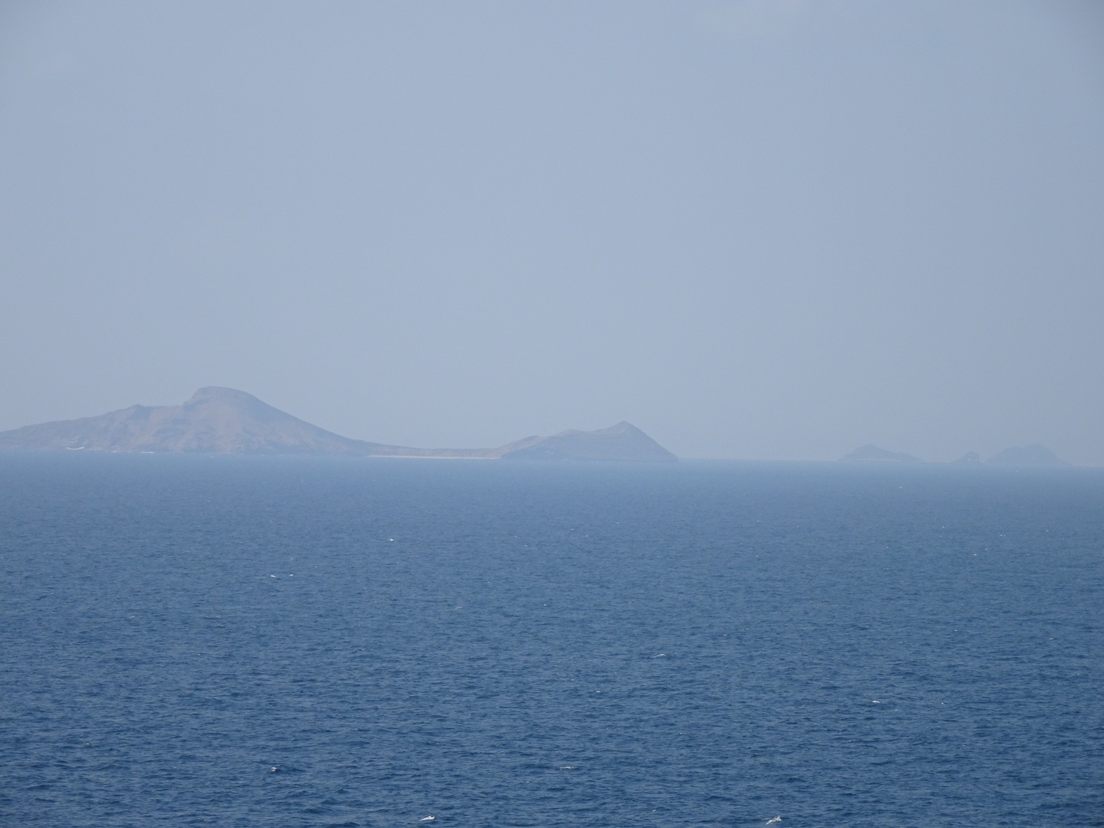Mit dem gerade in dieser Region piratengeschärften Blick erkennen wir im Dunstkleid erstmals wieder Land. Eine Insel mit zwei Bergen, so stelle ich mir Lummerland von der Augsburger Puppenkiste vor.