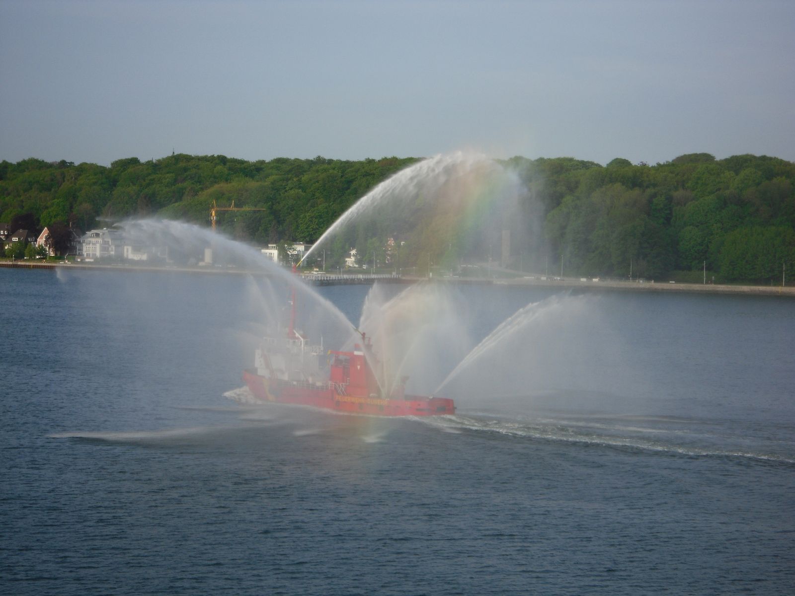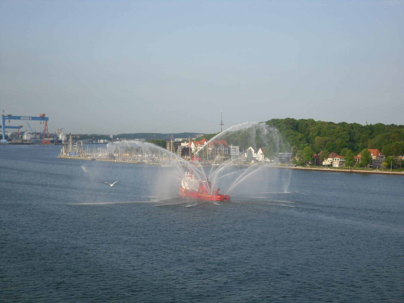 Ein Feuerlöschboot gesellte sich zu uns und zeigte, was es so drauf hat. Das Wasser schoss eindrucksvoll aus allen Rohren.